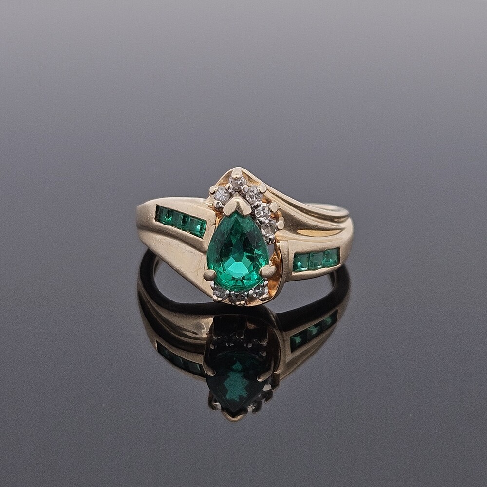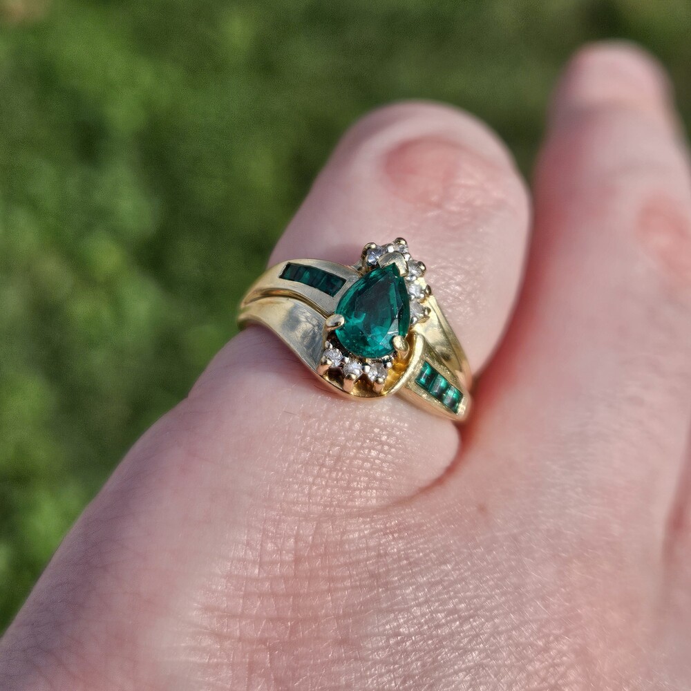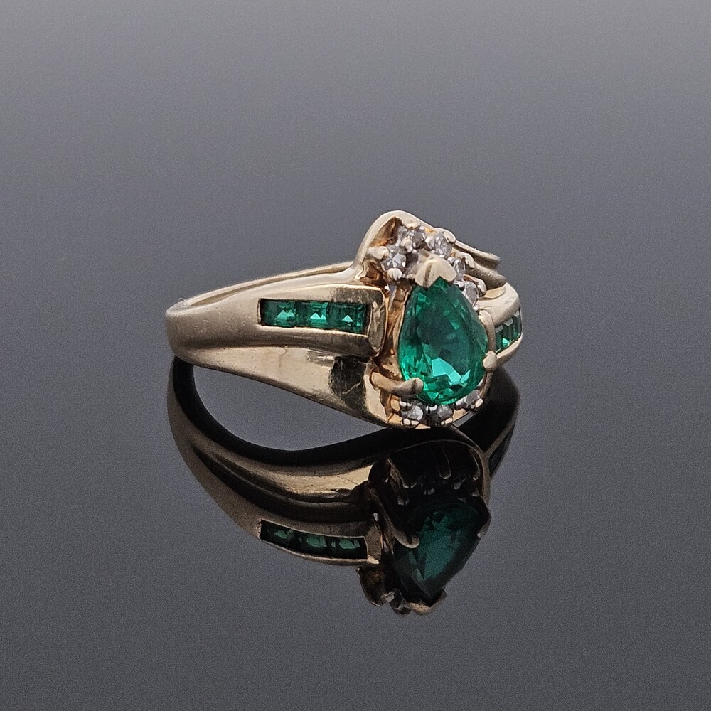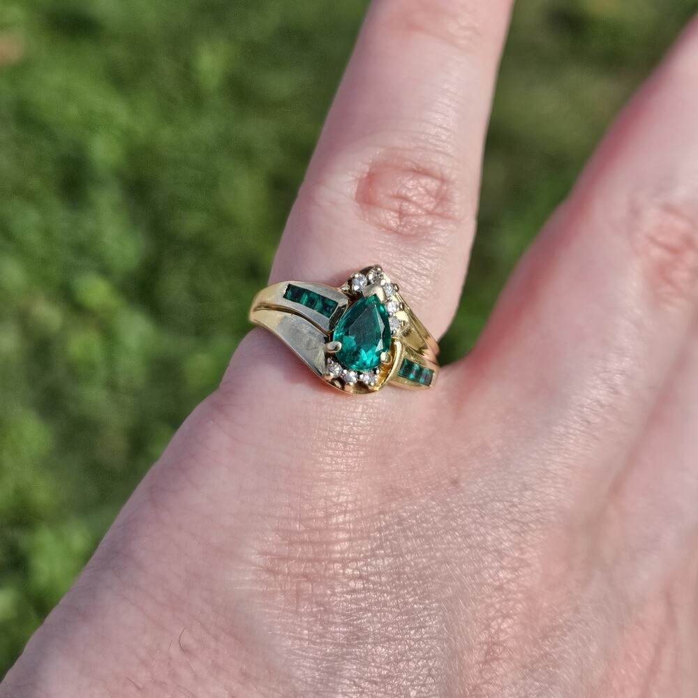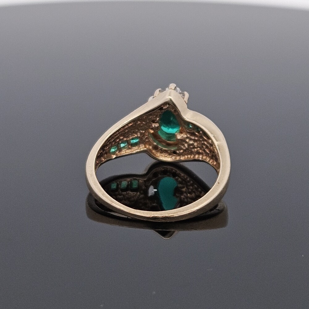 10K Yellow Gold Diamond Lab Created Emerald Bypass Cocktail Ring Size 5.5
