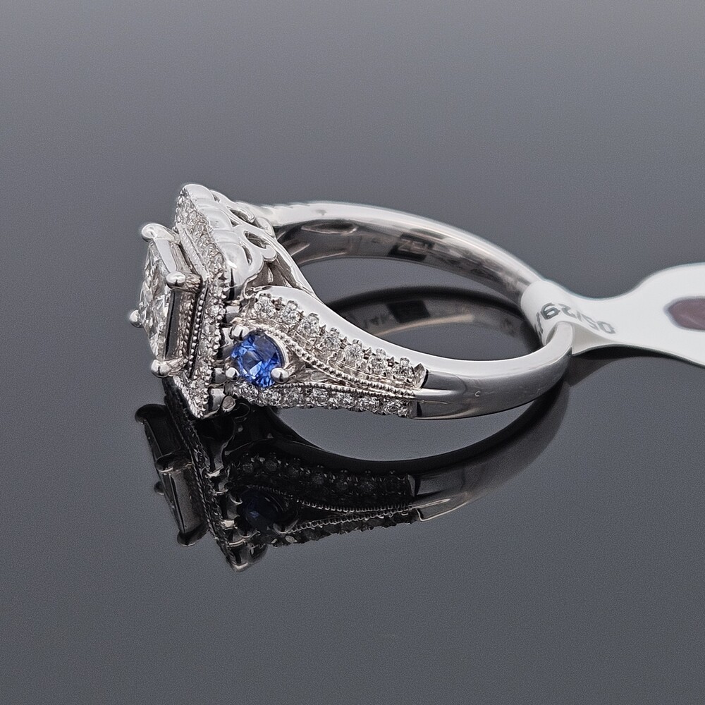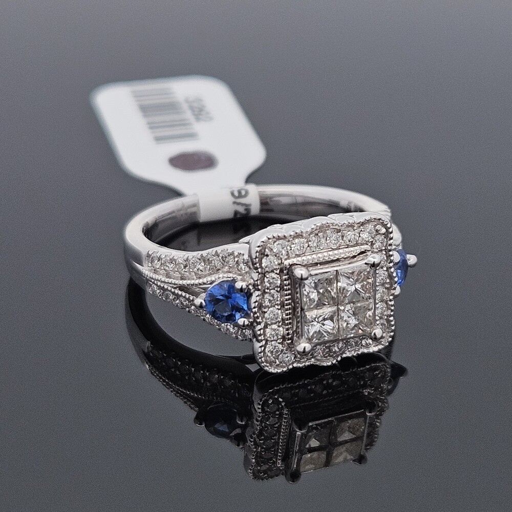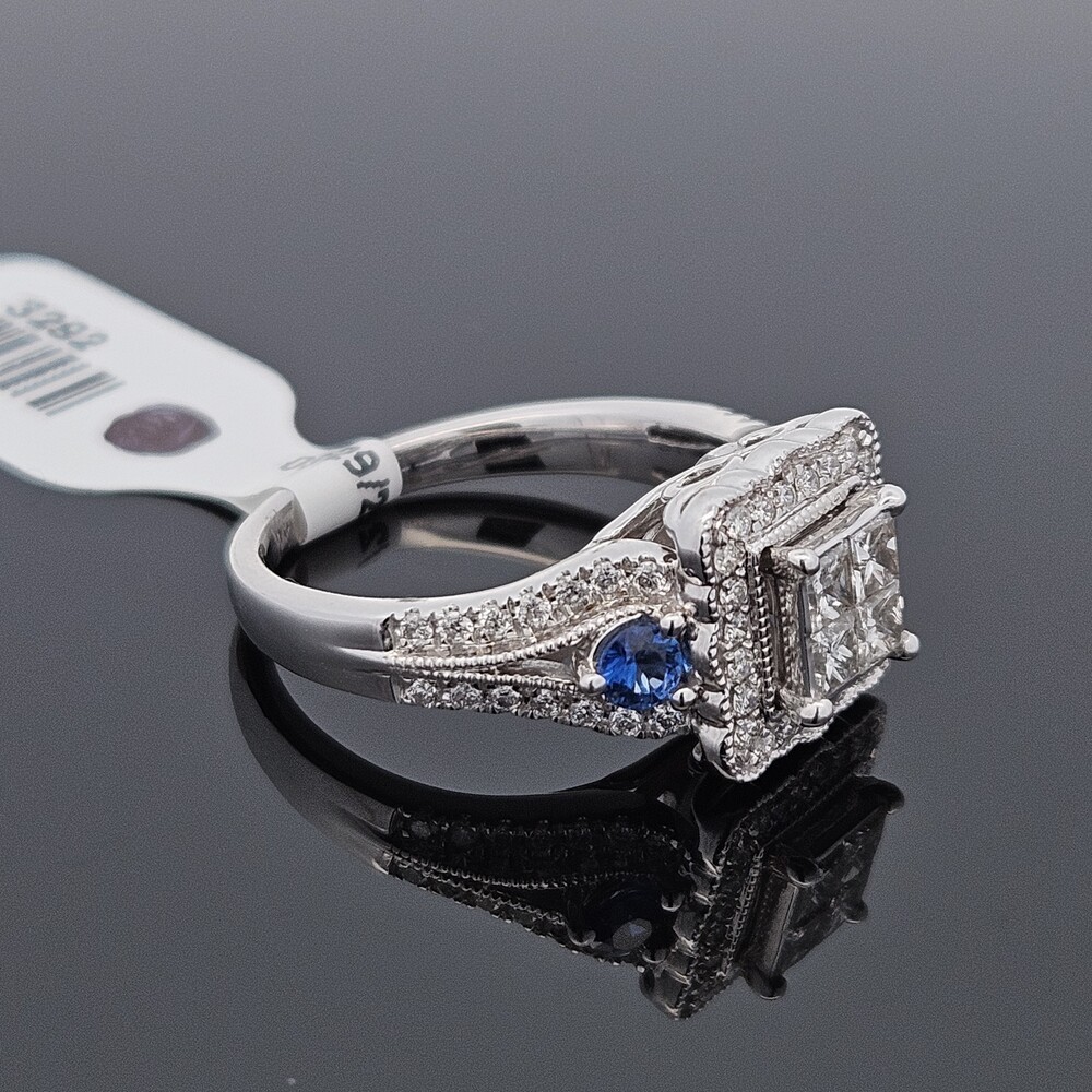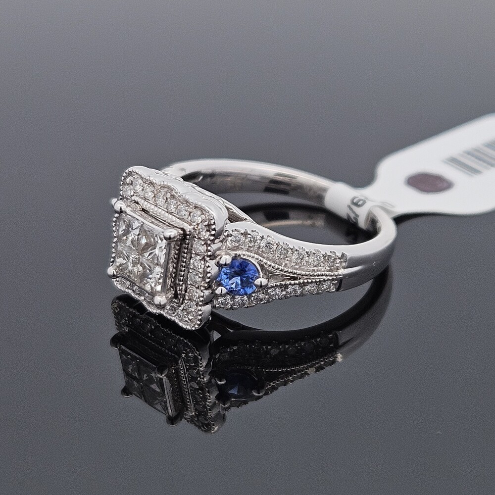 One 14KT White Gold Diamond & Natural Blue Sapphire Halo Style Engagement Ring