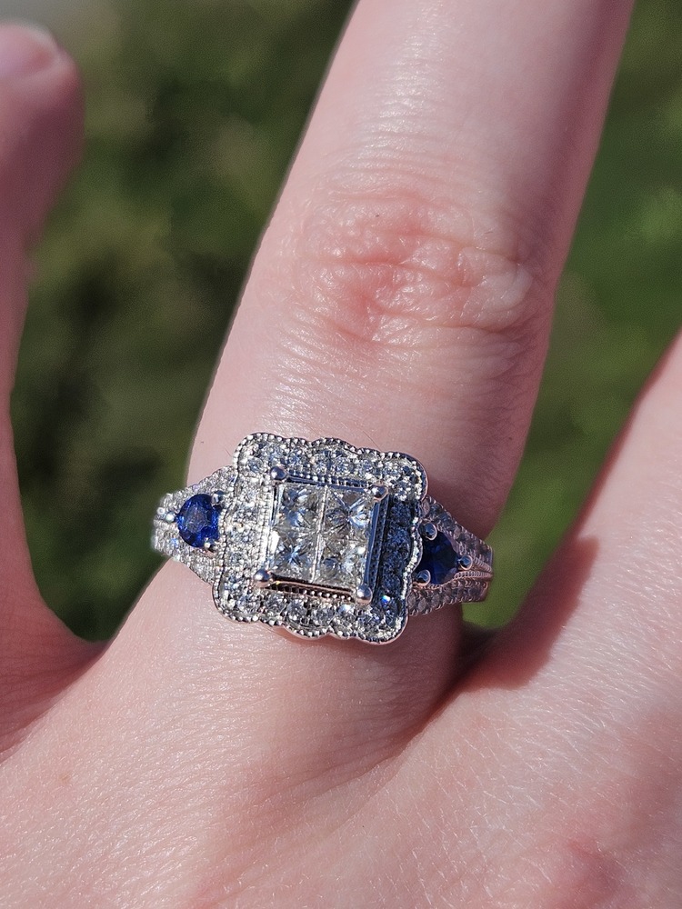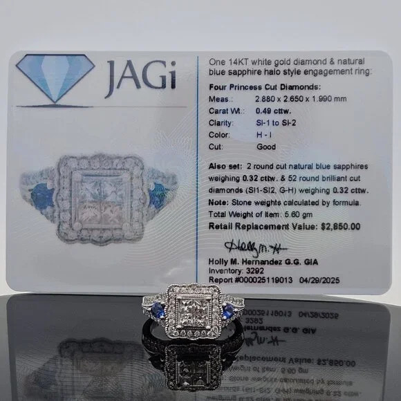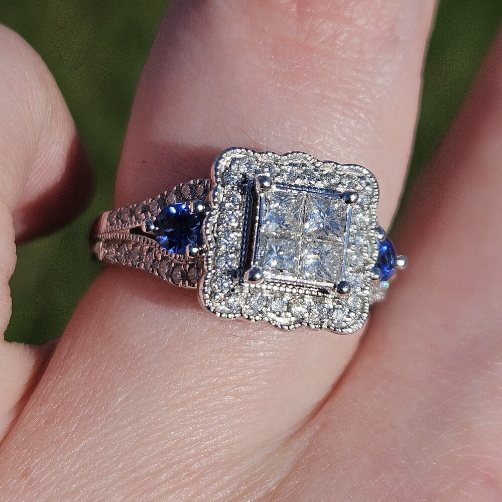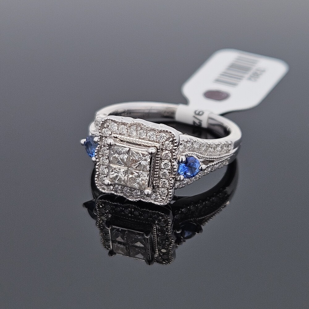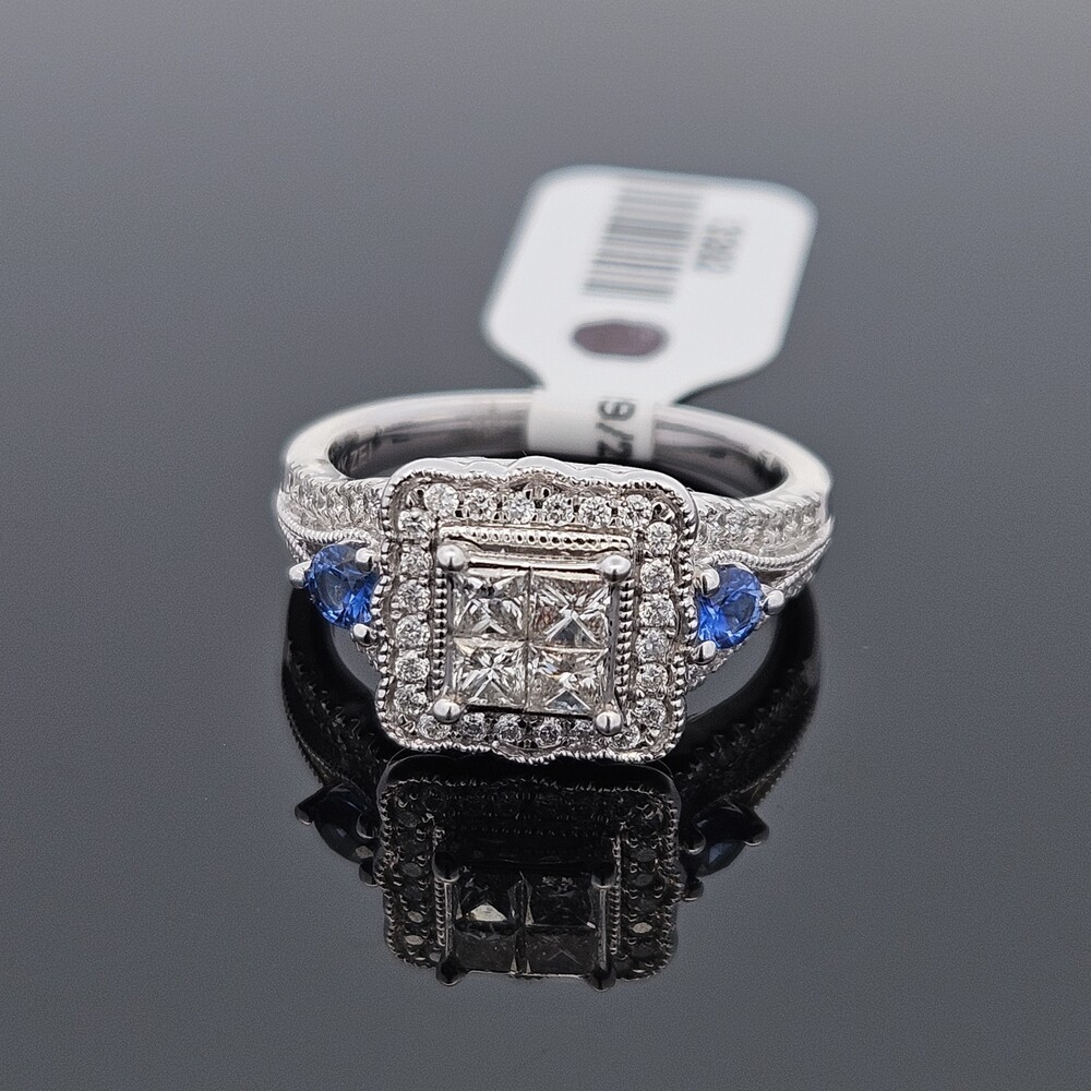 One 14KT White Gold Diamond & Natural Blue Sapphire Halo Style Engagement Ring