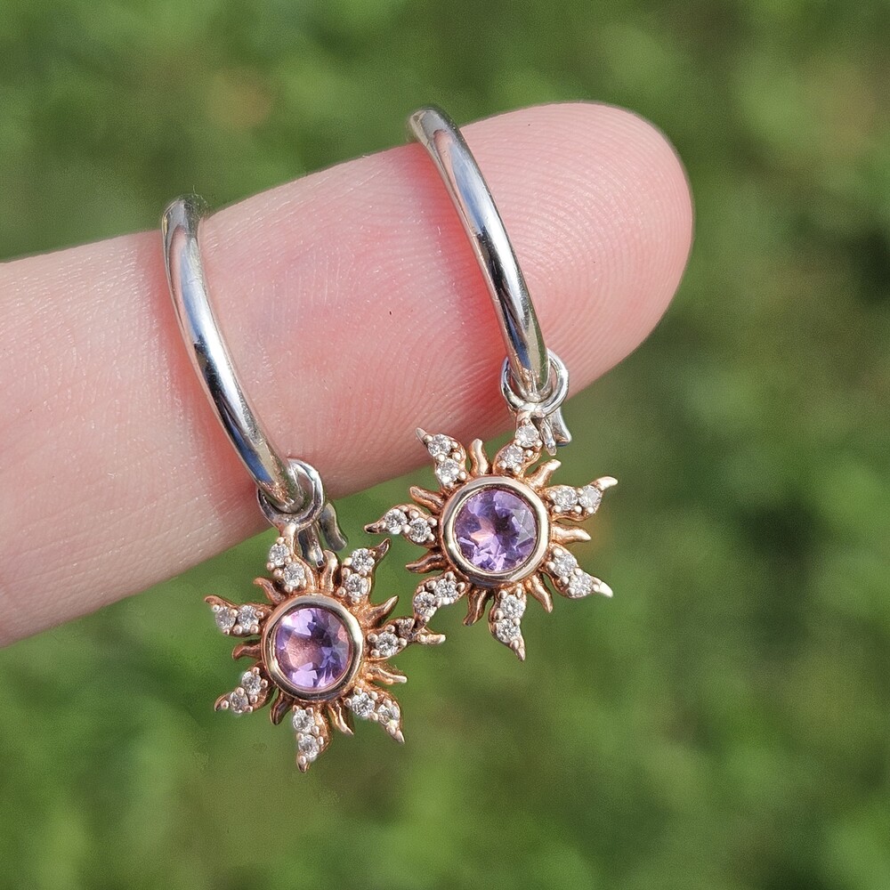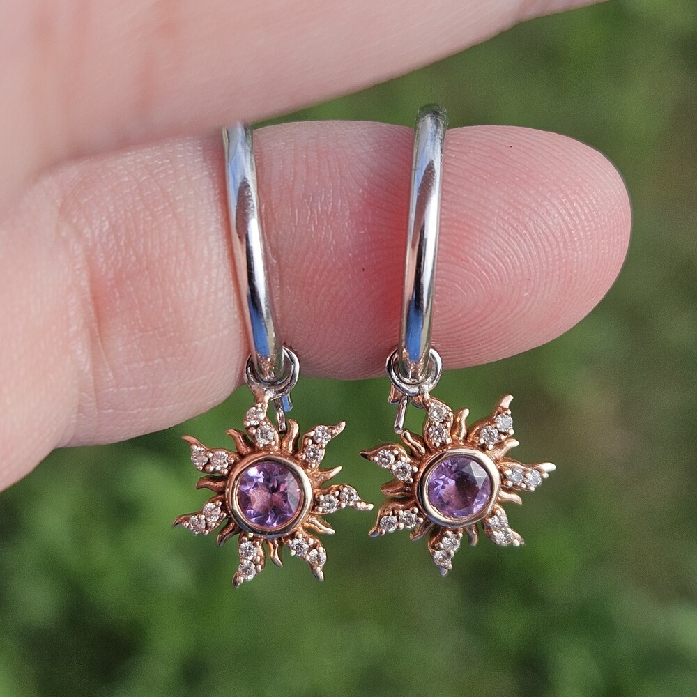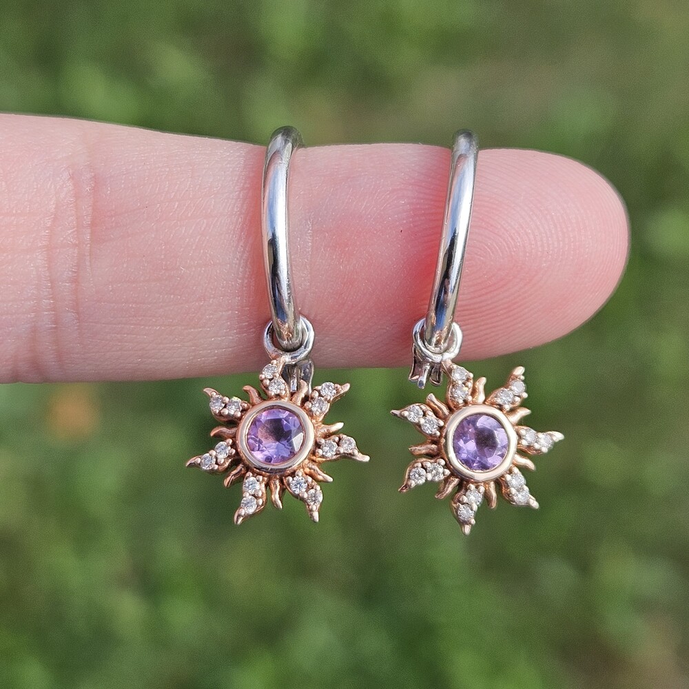 Disney Enchanted Rapunzel Amethyst Diamond Sun Drop Earrings Sterling 10K Gold
