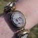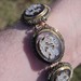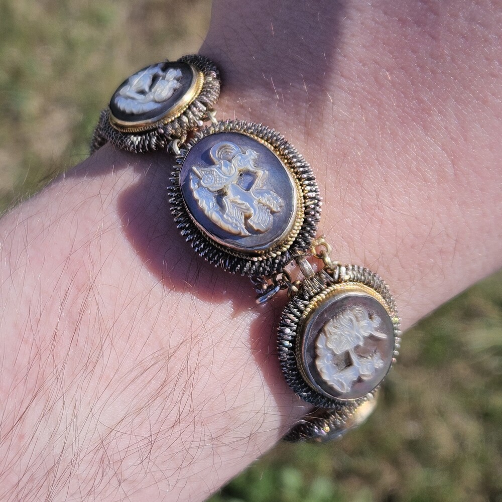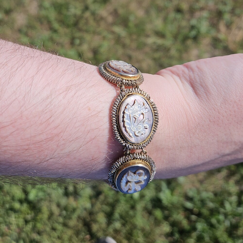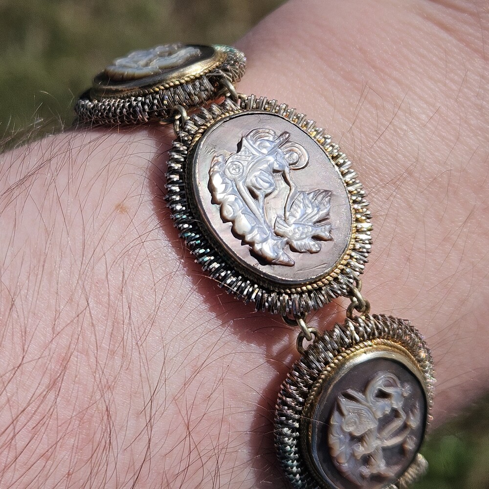 Silver Mother of Pearl Etched Greek Roman Chariots Art Deco Bracelet 7 Inches