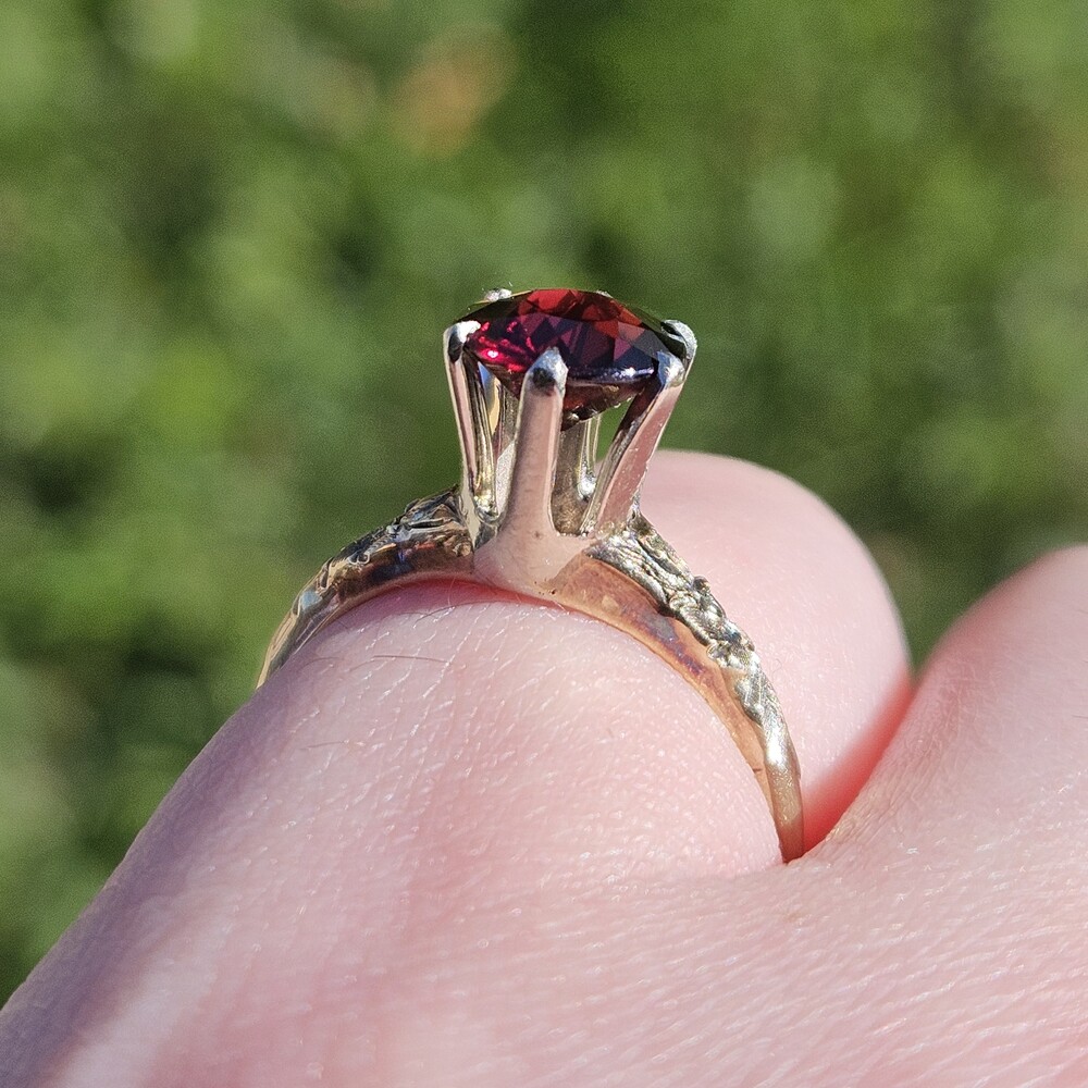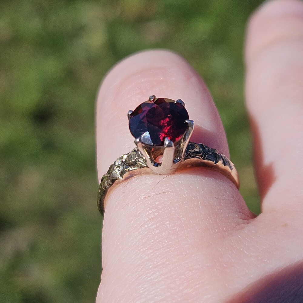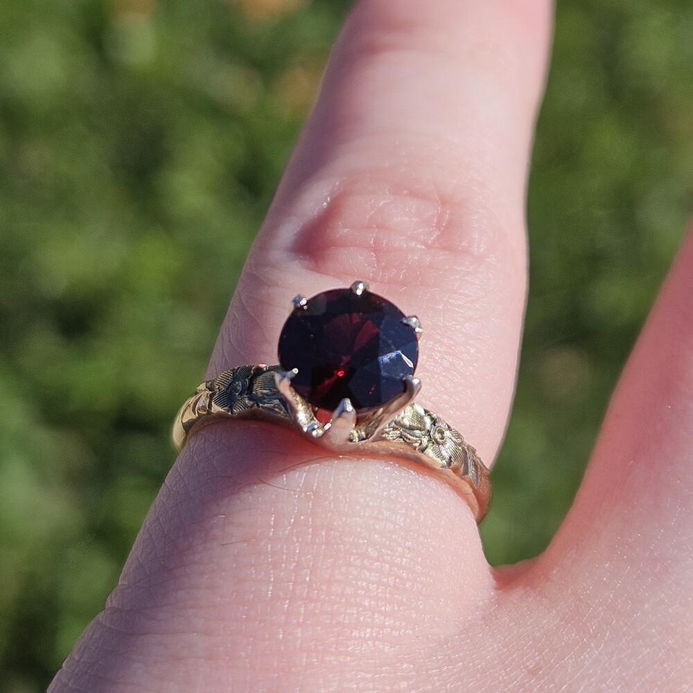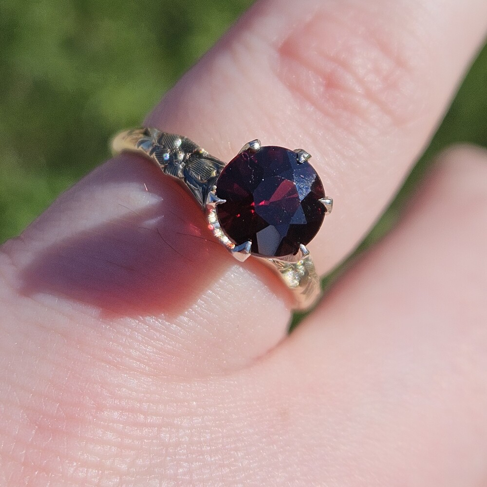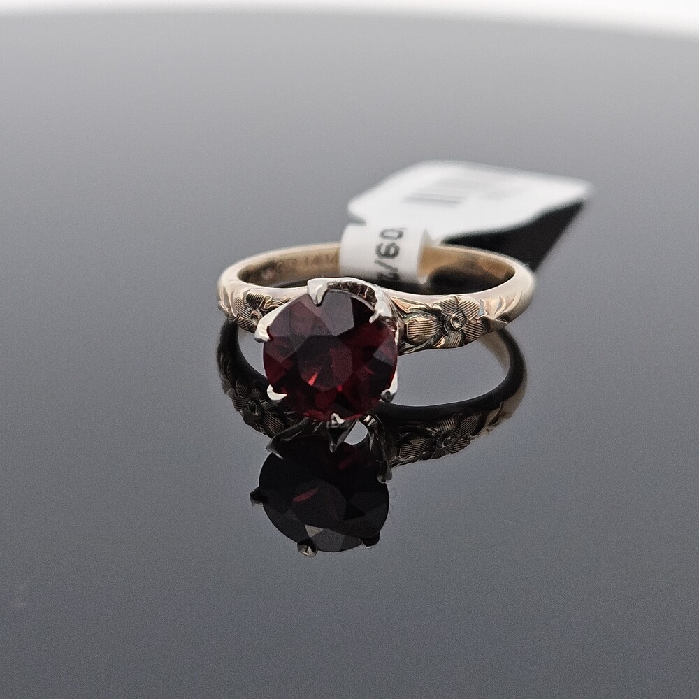 Vintage 14K Yellow Gold Round Garnet Etched Flower Solitaire Ring Size 6