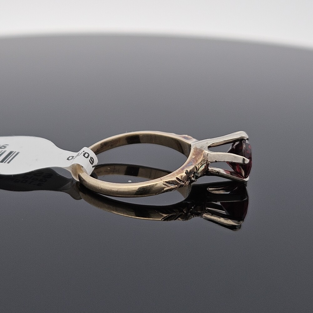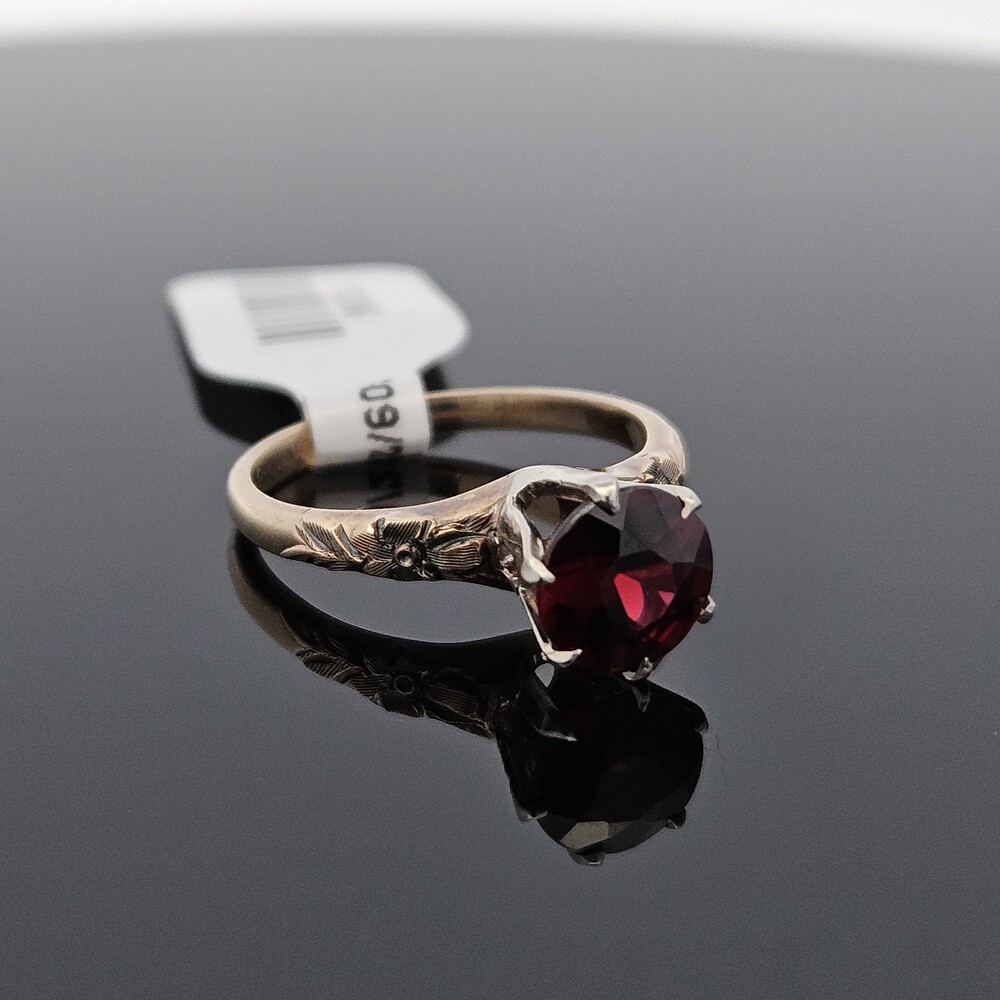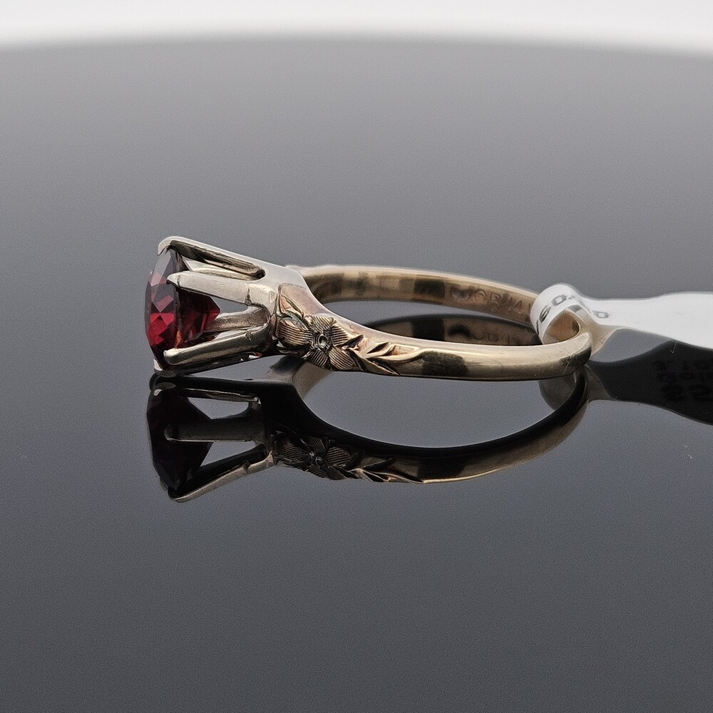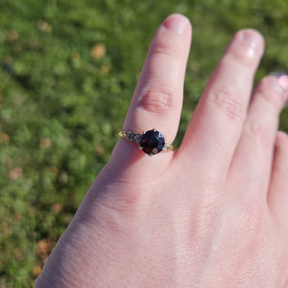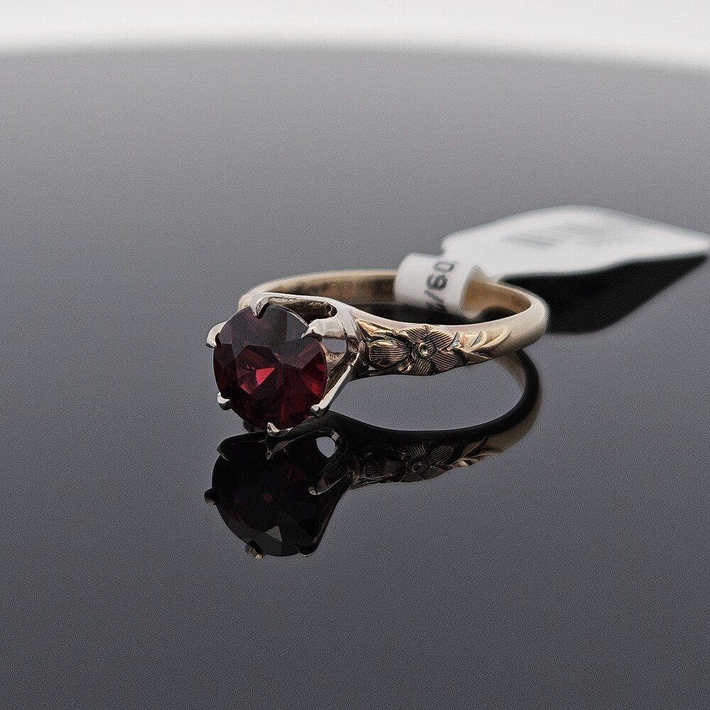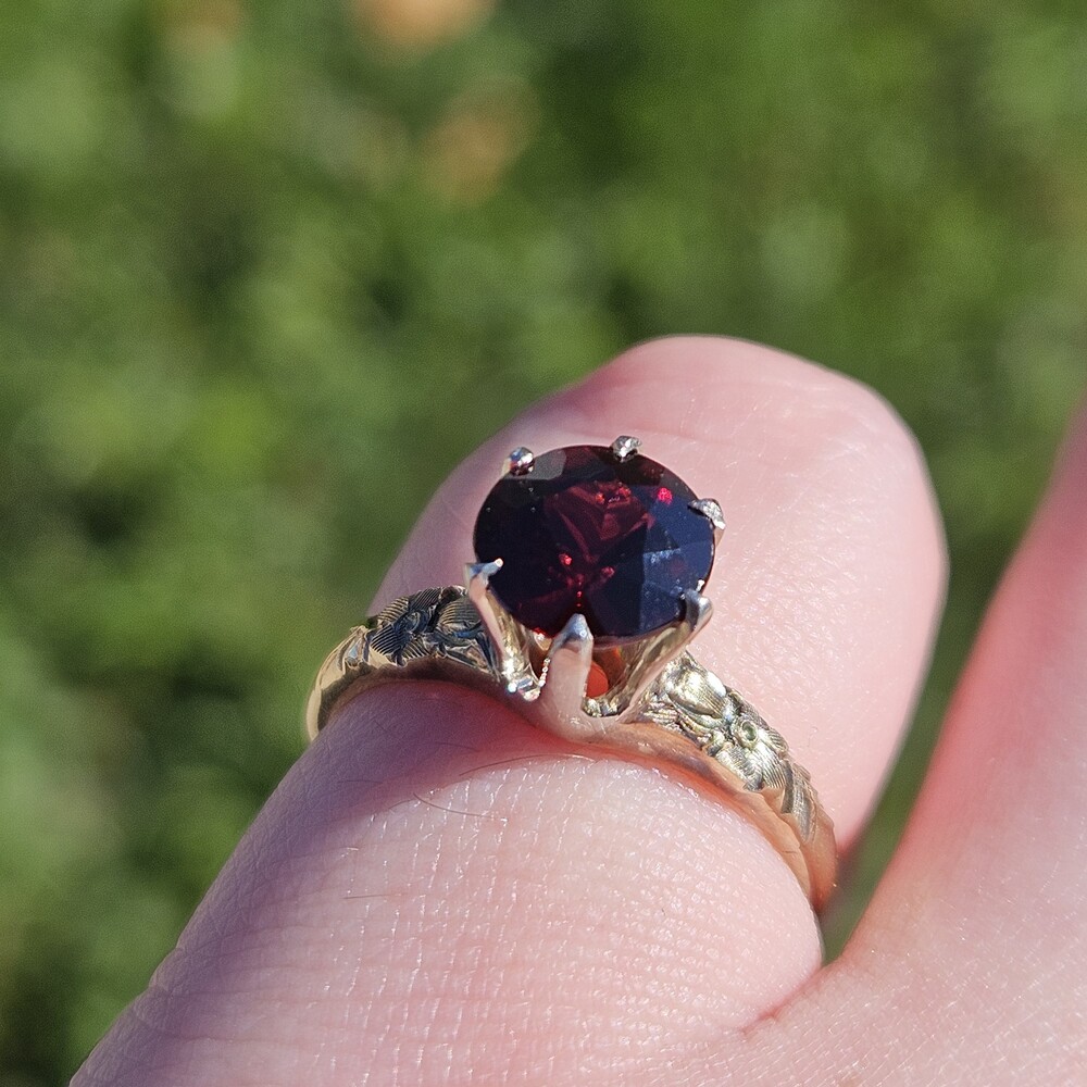 Vintage 14K Yellow Gold Round Garnet Etched Flower Solitaire Ring Size 6