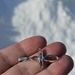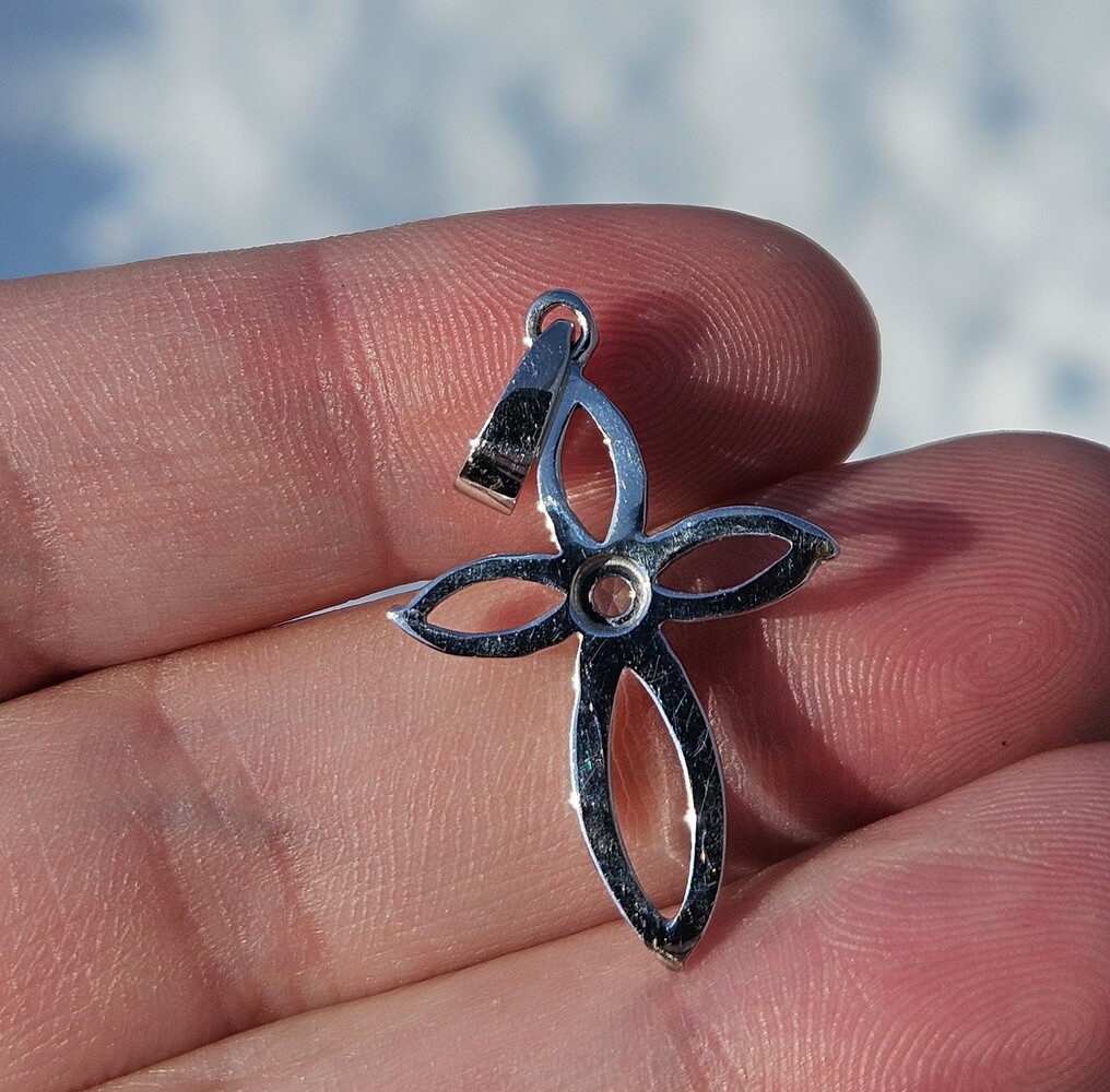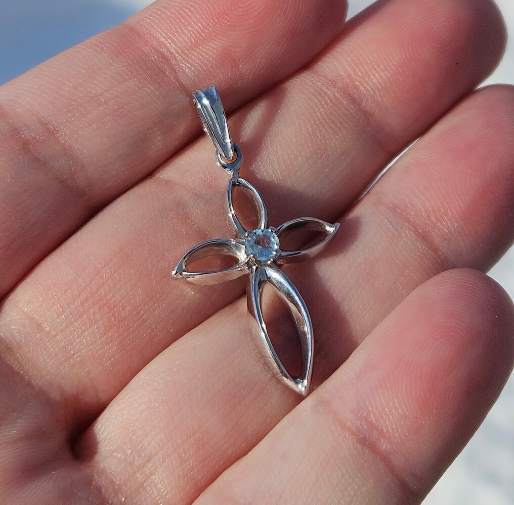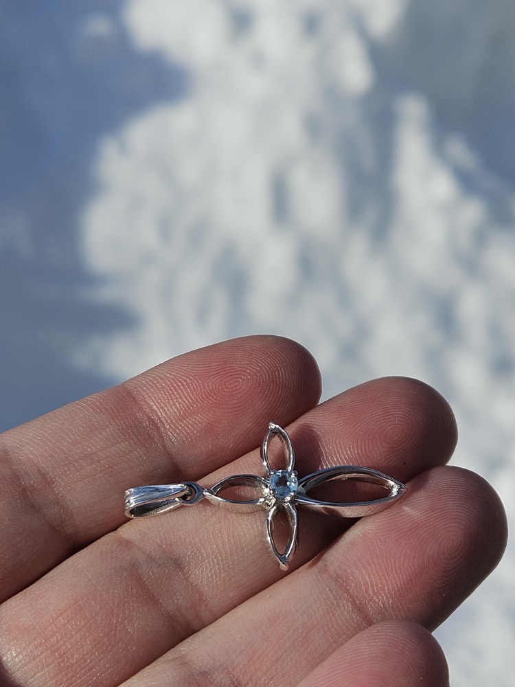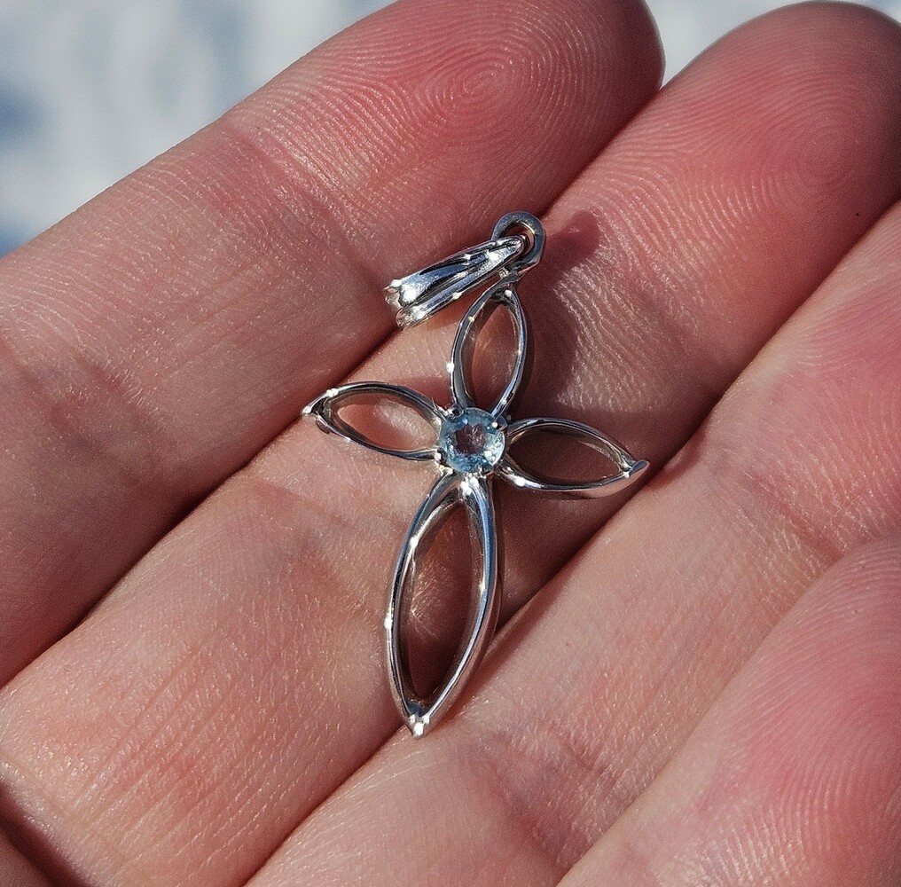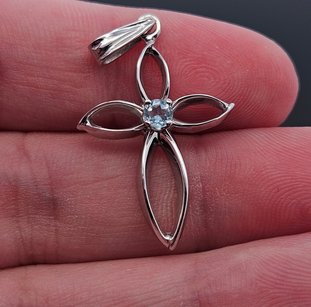 10K White Gold Aquamarine Curved Filigree Cross Pendant Charm 1x.75 Inches