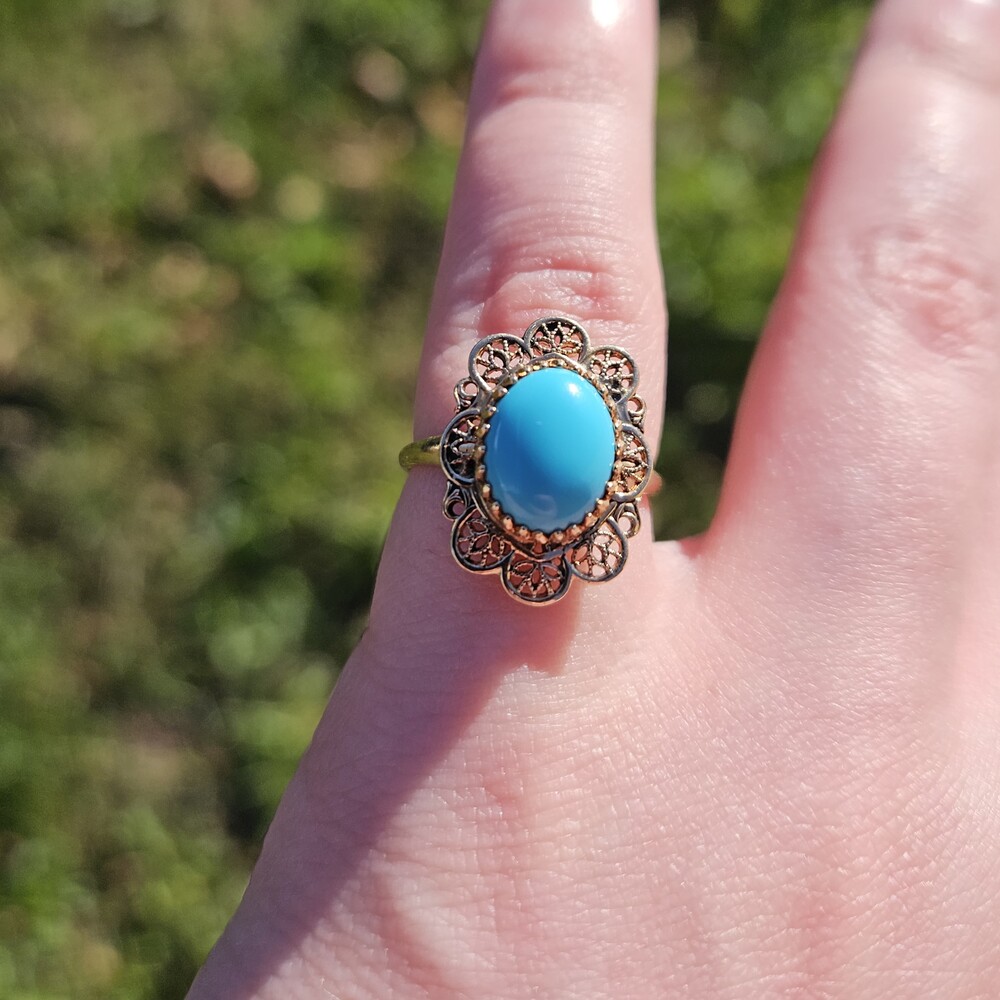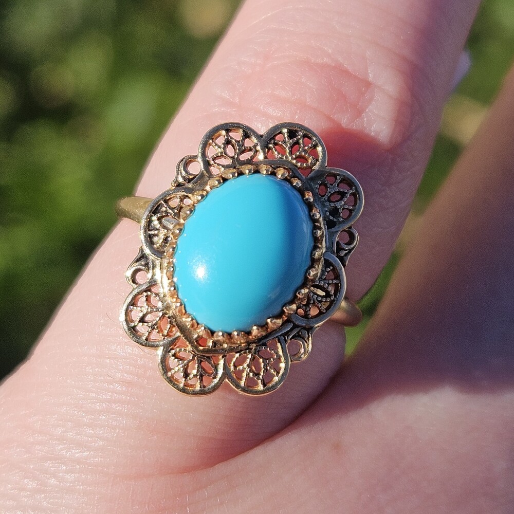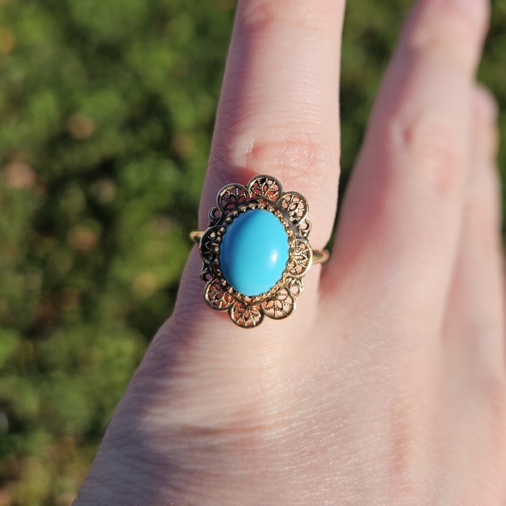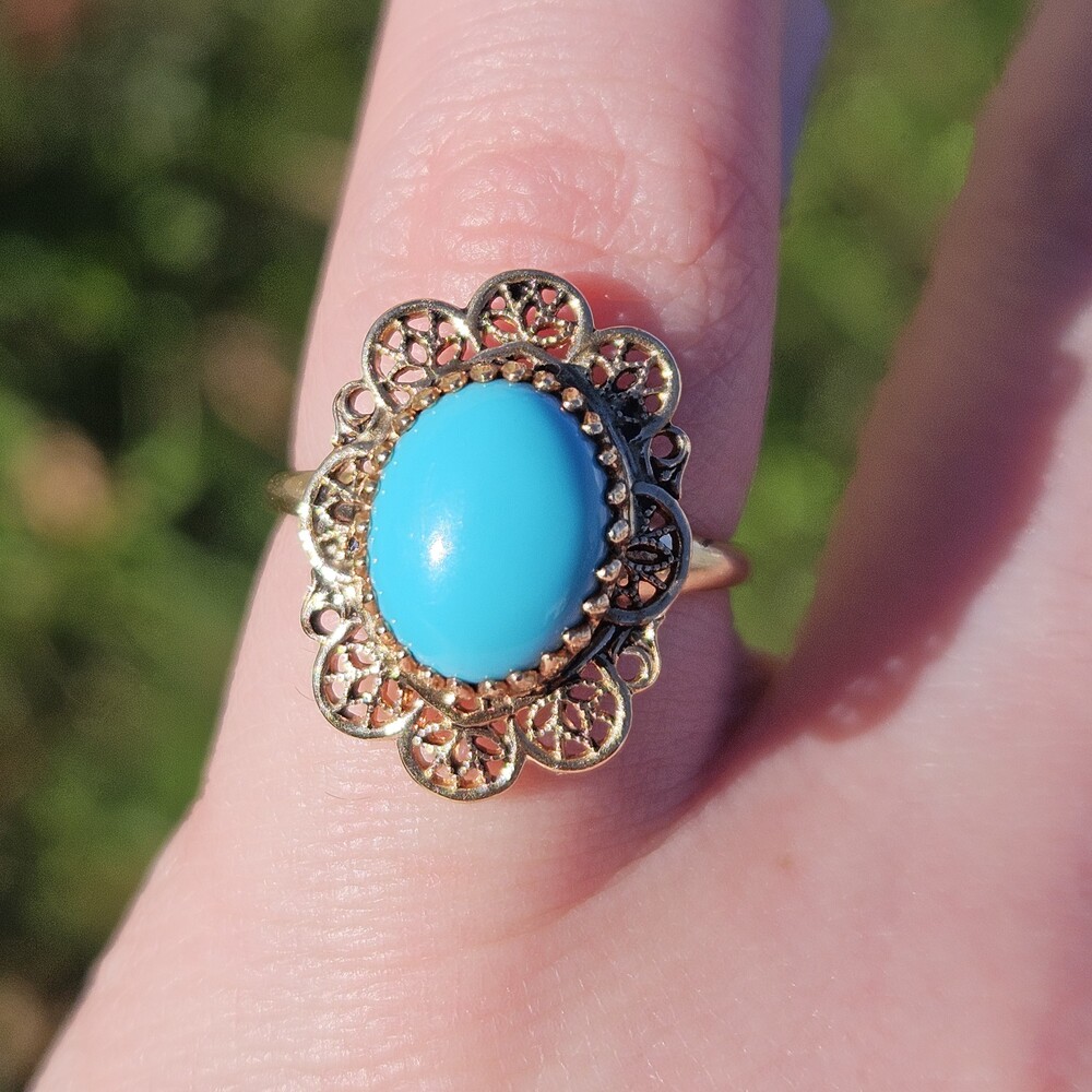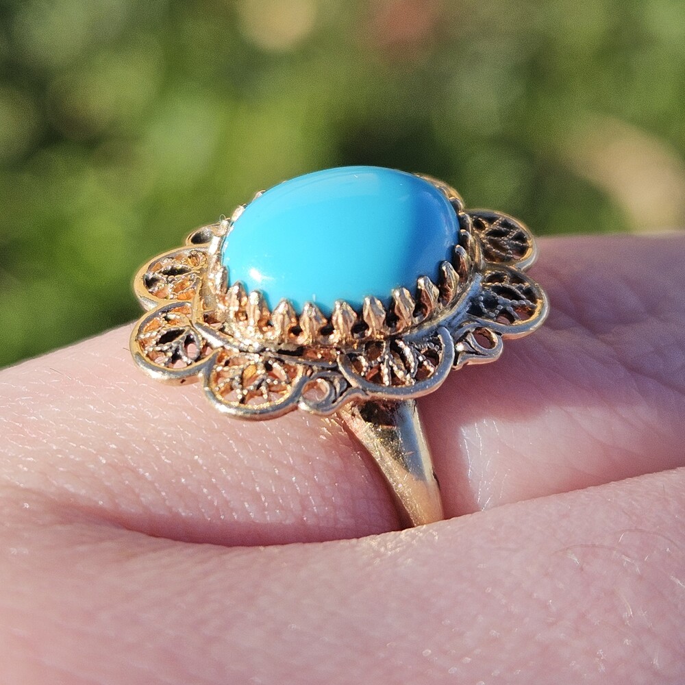 10K Yellow Gold Filigree Lace Flower Turquoise Stone Cocktail Ring Size 5.25