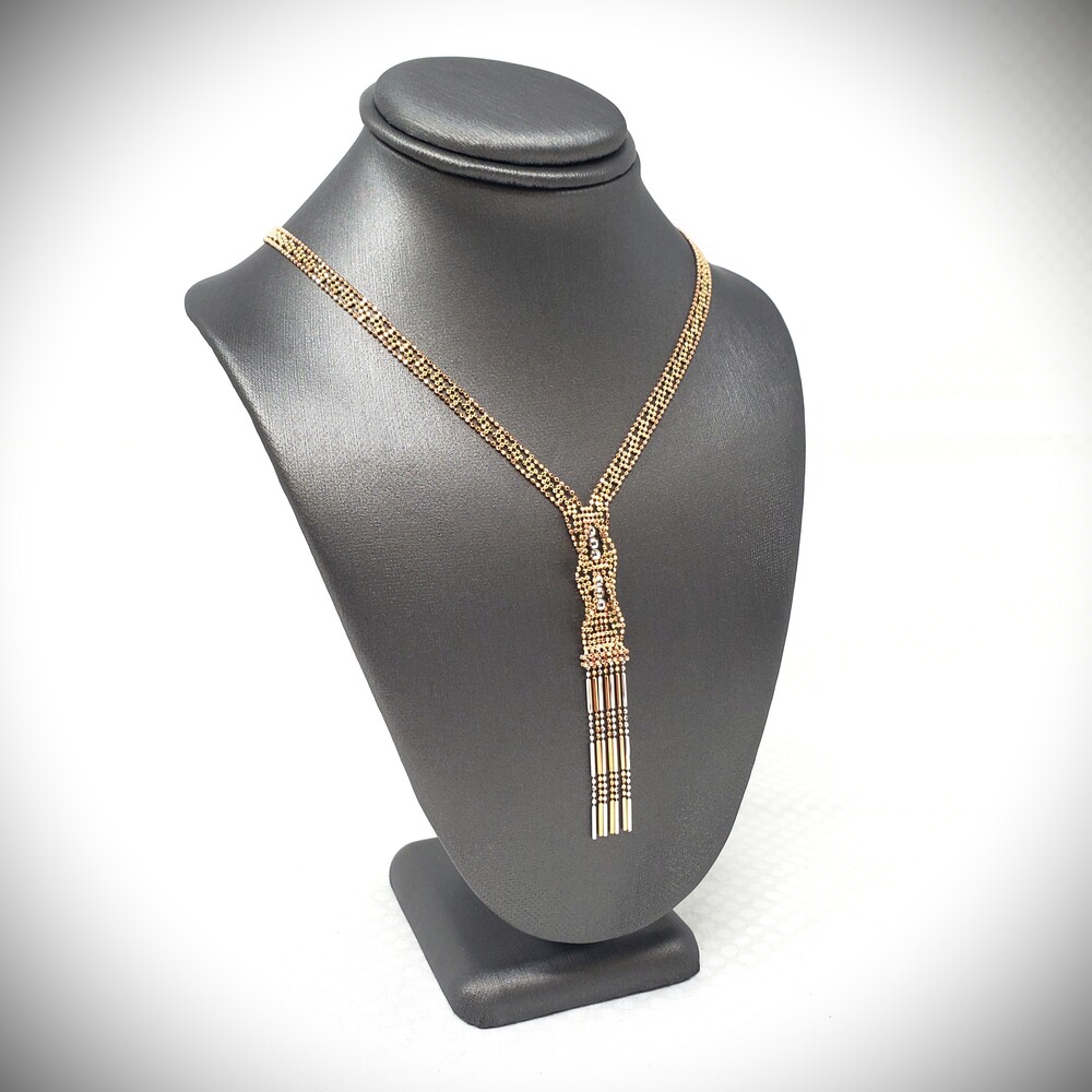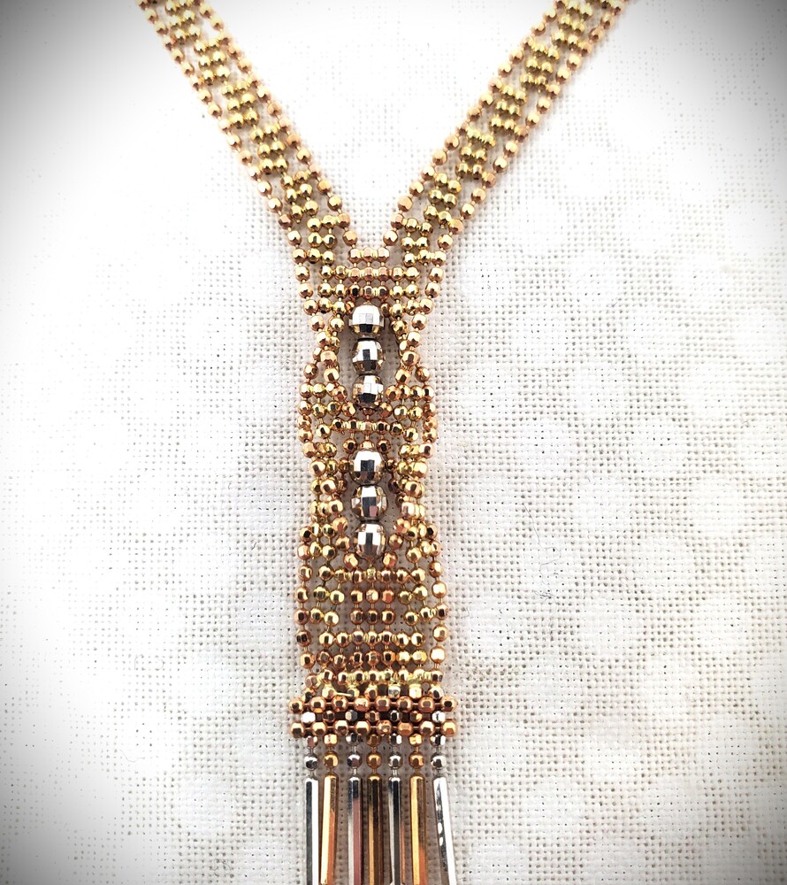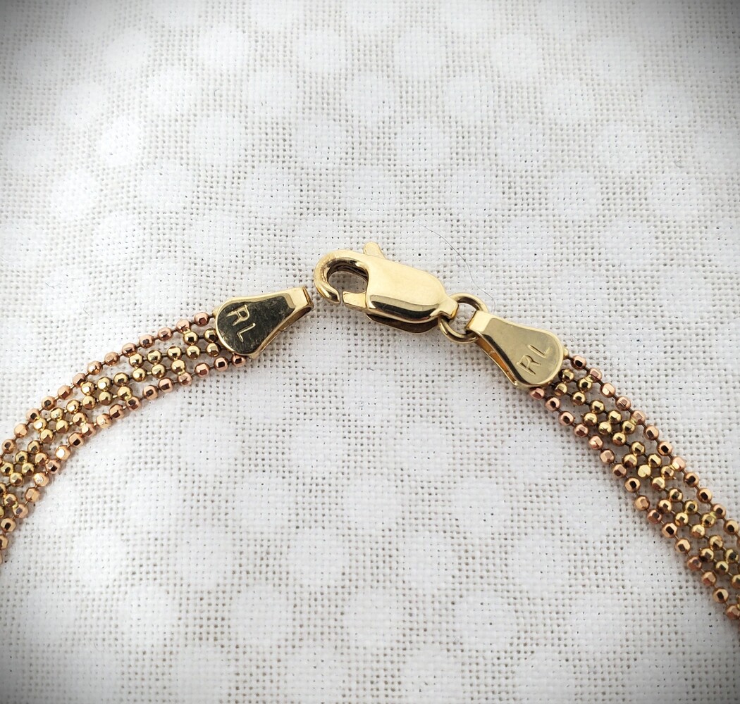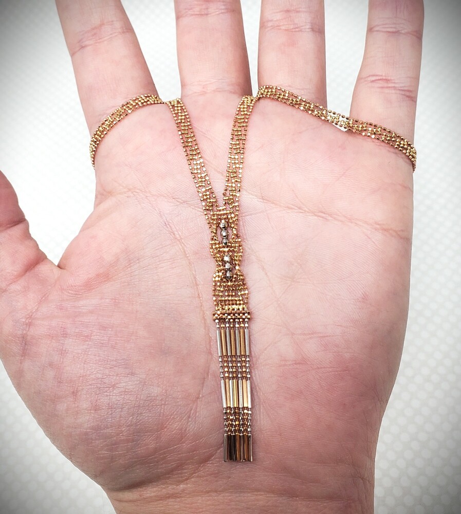 This elegant 14K solid gold lariat necklace features a stunning tri-color design crafted in rose, white, and yellow gold with delicate beaded accents. The lariat style adds a graceful, modern touch while maintaining timeless fine jewelry appeal.