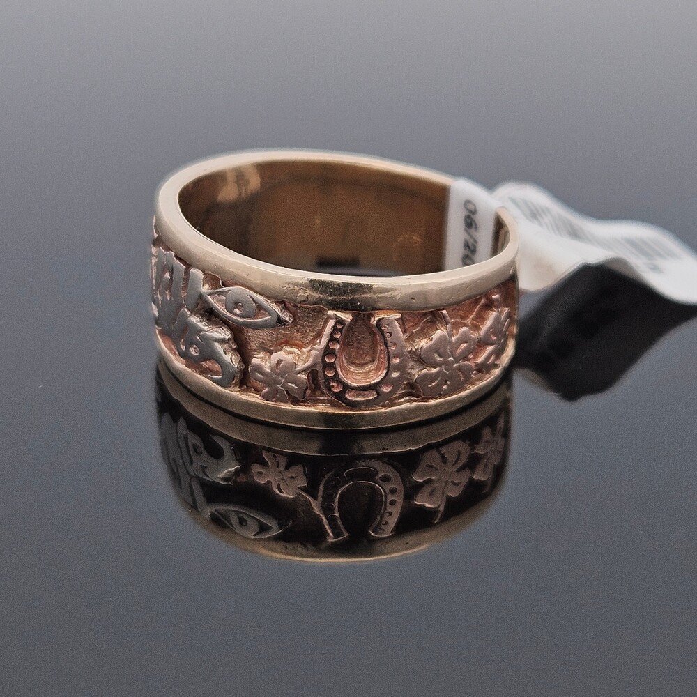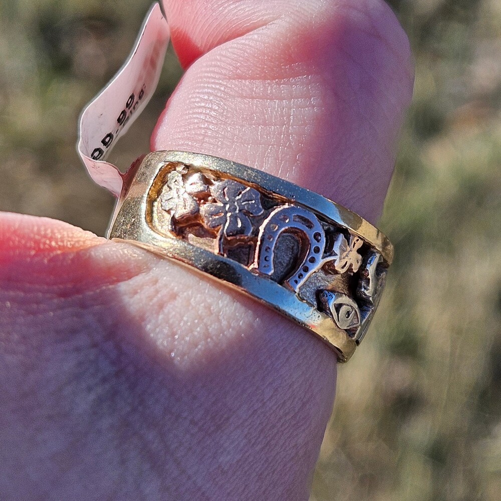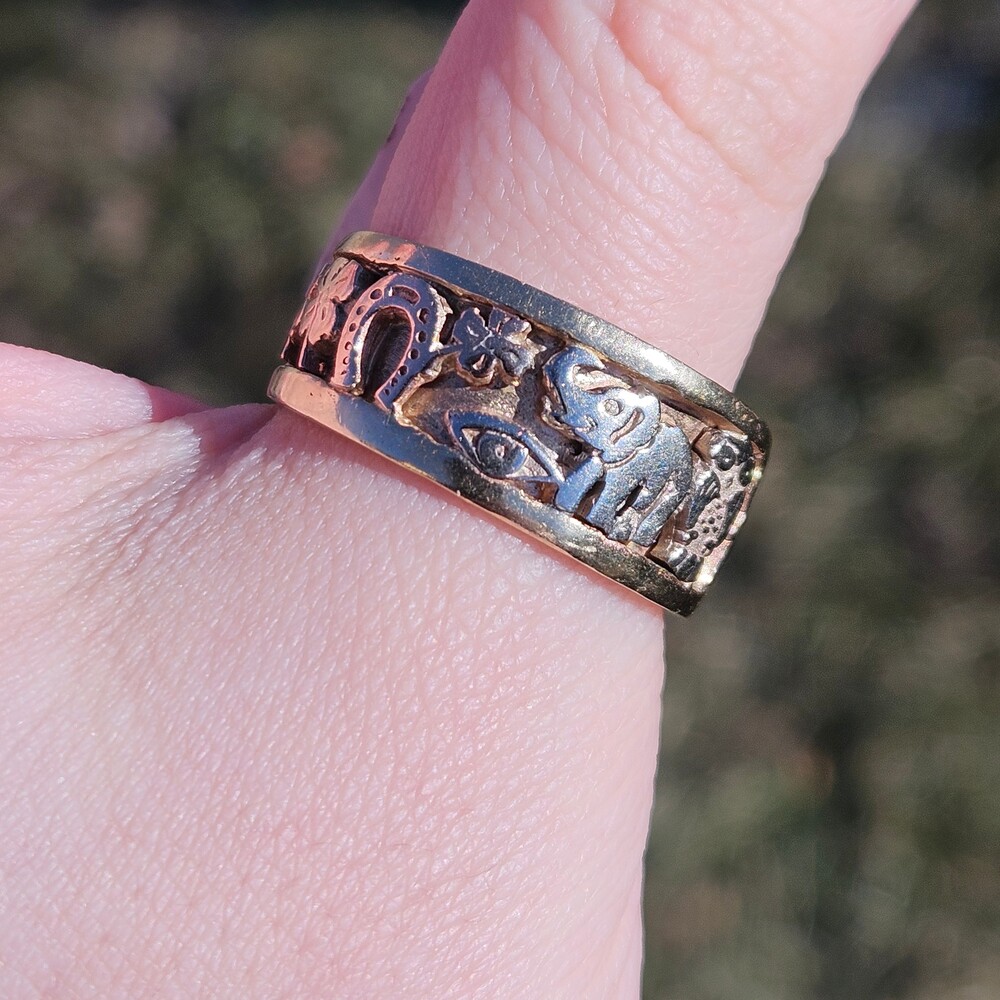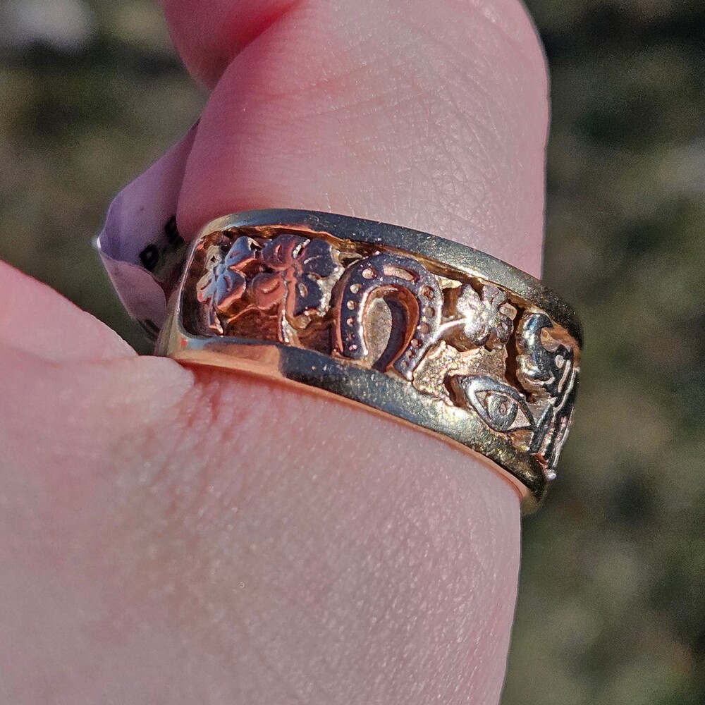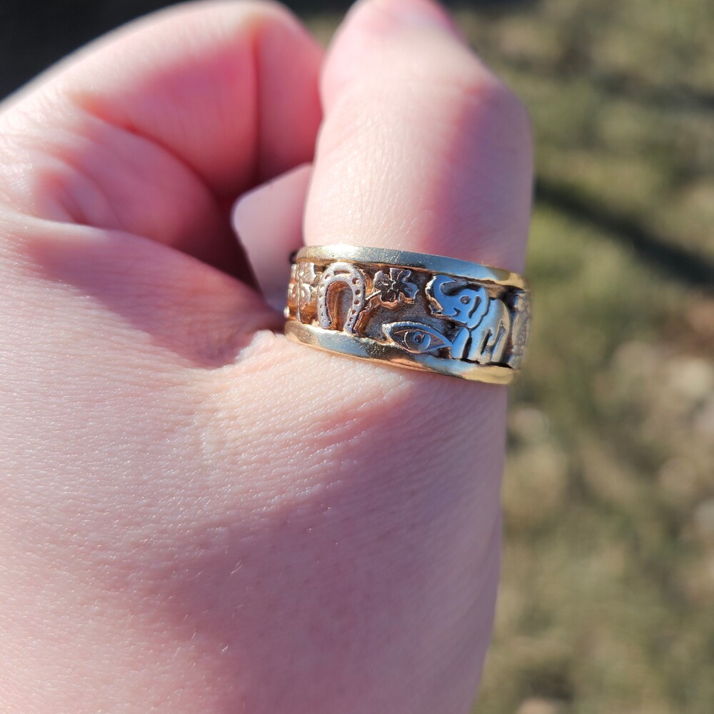 14K Tri Color Gold Good Luck Lucky 7 Elephant Horseshoe Wide Band Ring Size 11