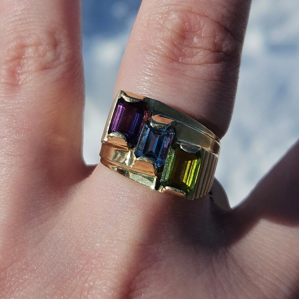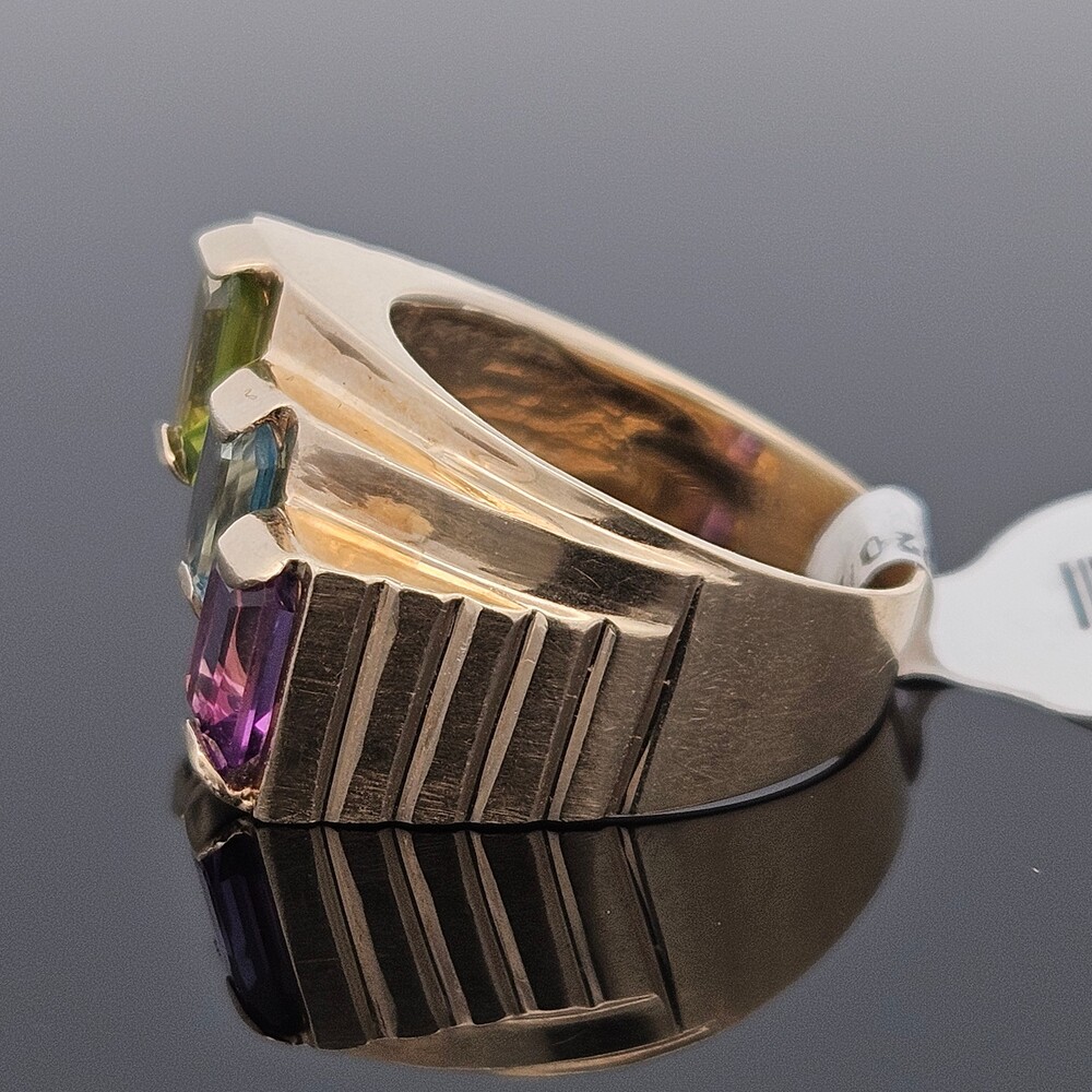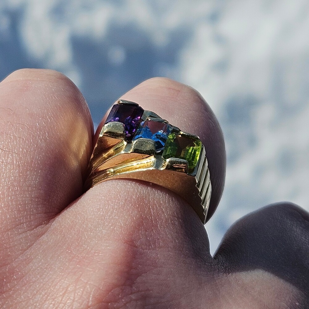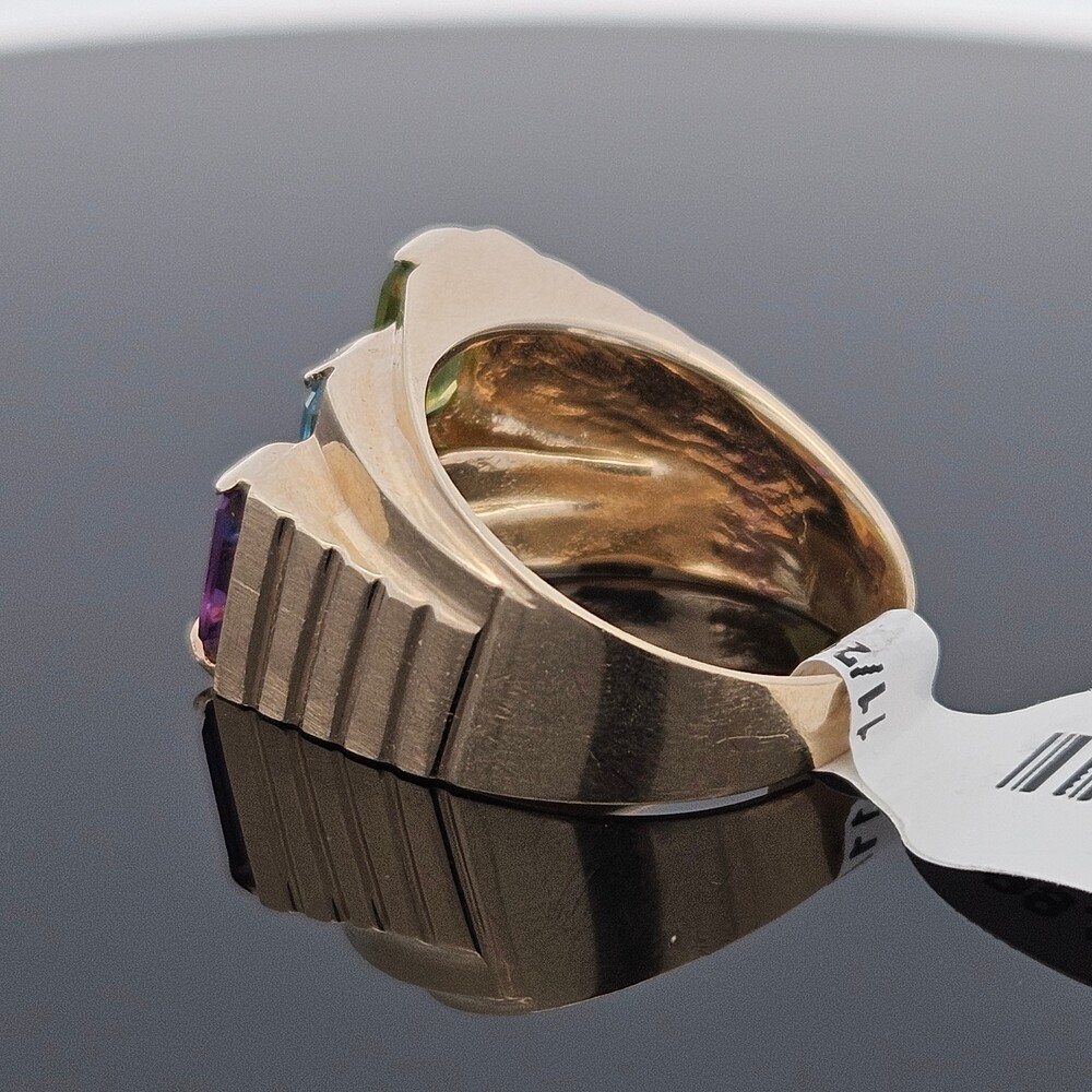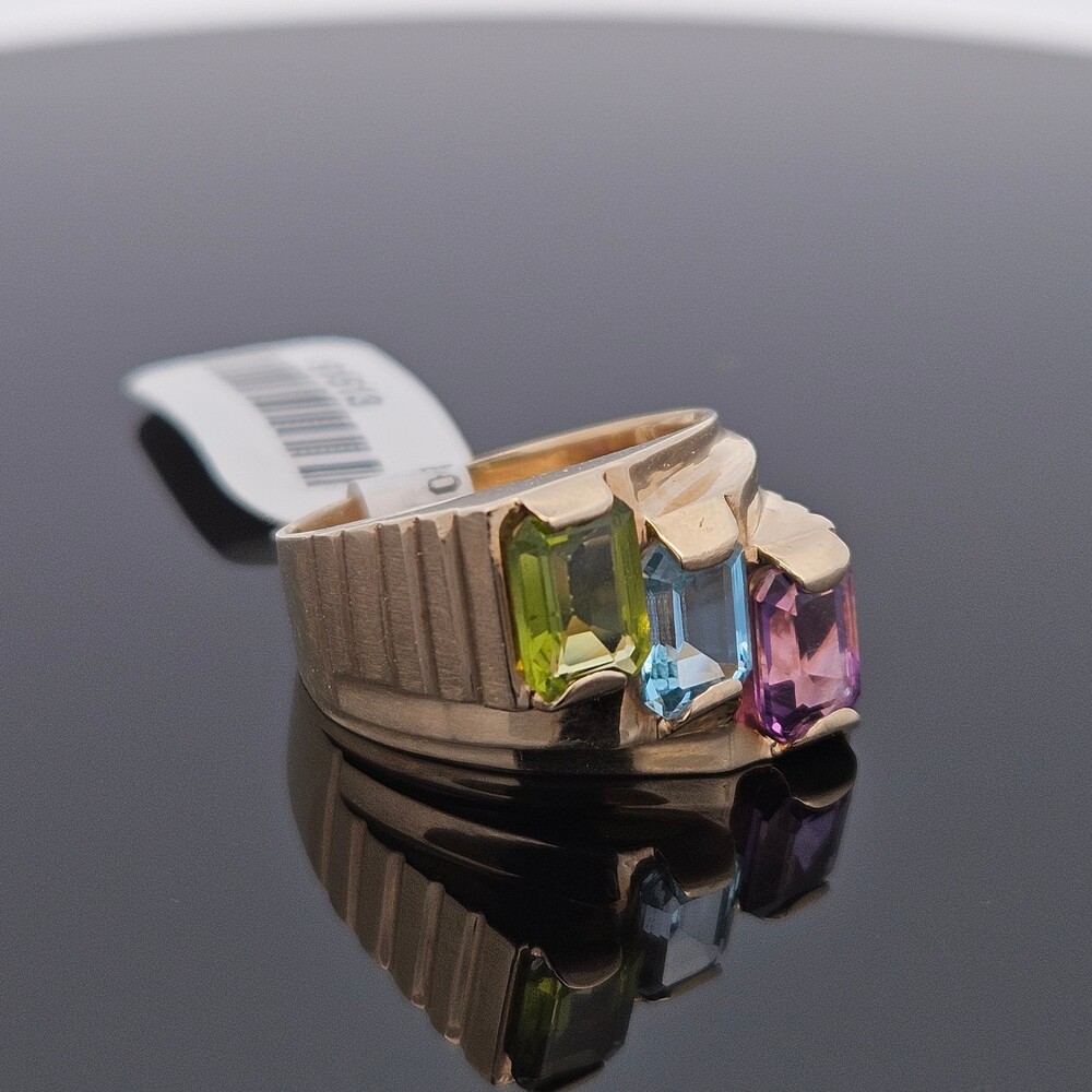 14K Yellow Gold Amethyst Blue Topaz Peridot Wide Band Mother's Ring Size 7.75