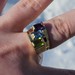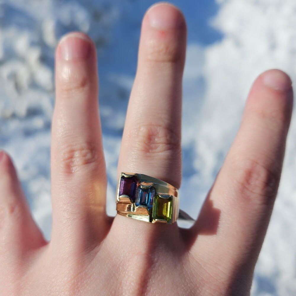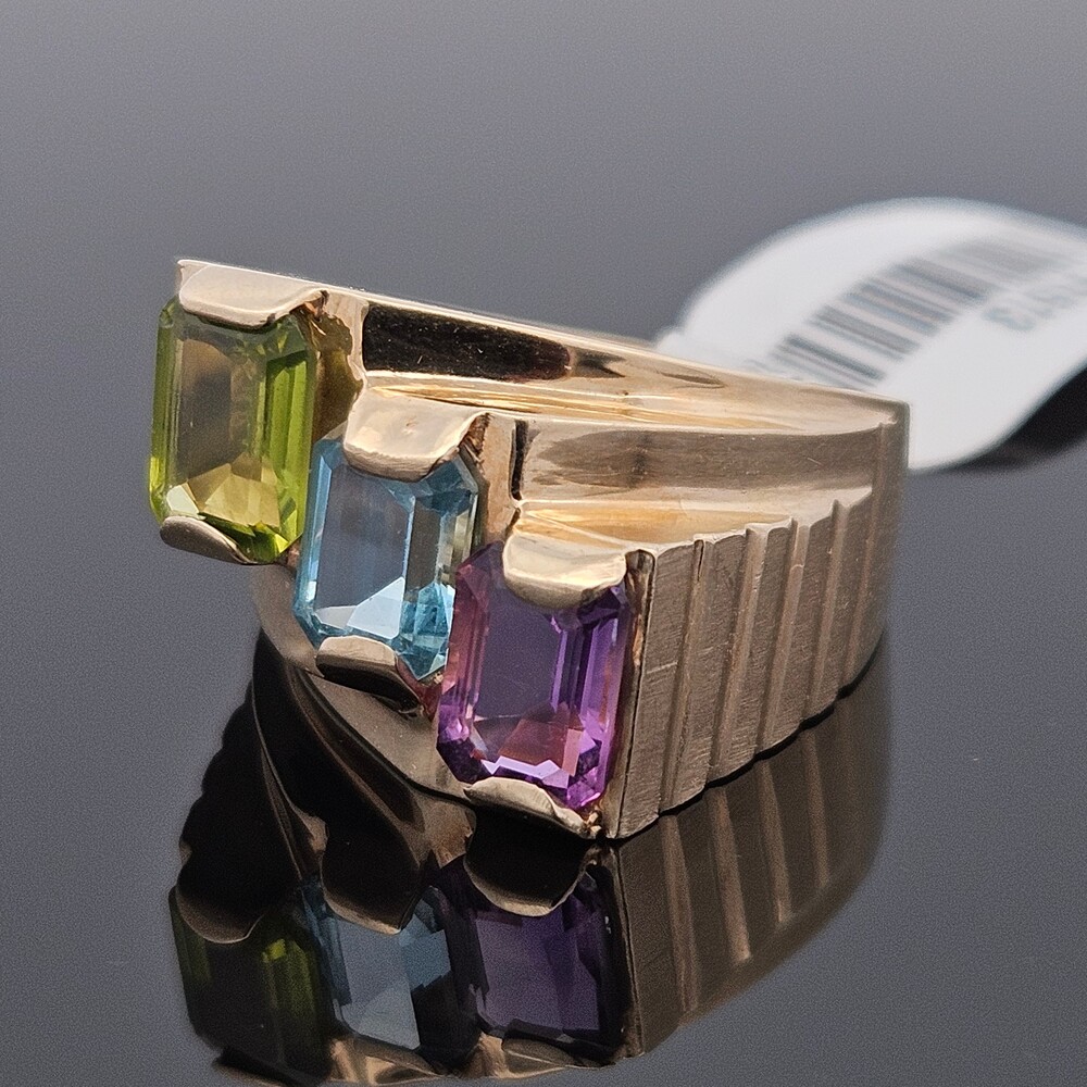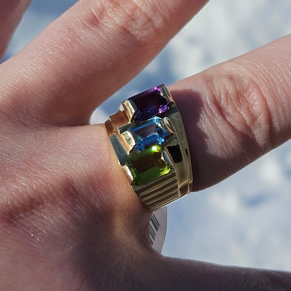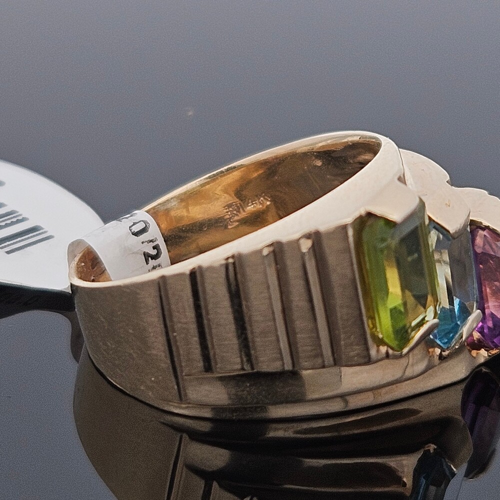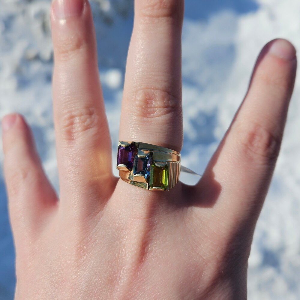 14K Yellow Gold Amethyst Blue Topaz Peridot Wide Band Mother's Ring Size 7.75