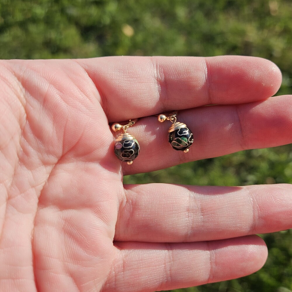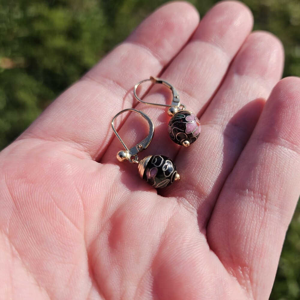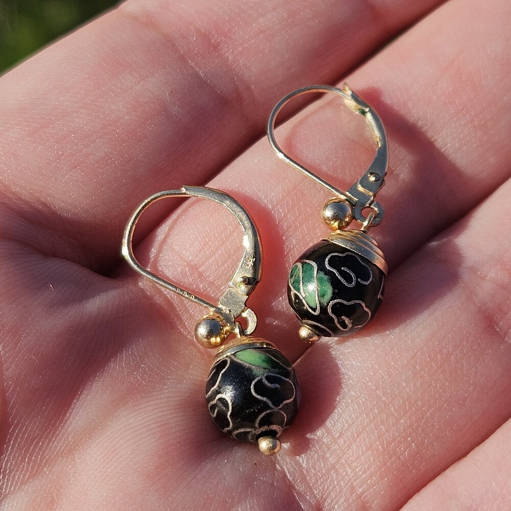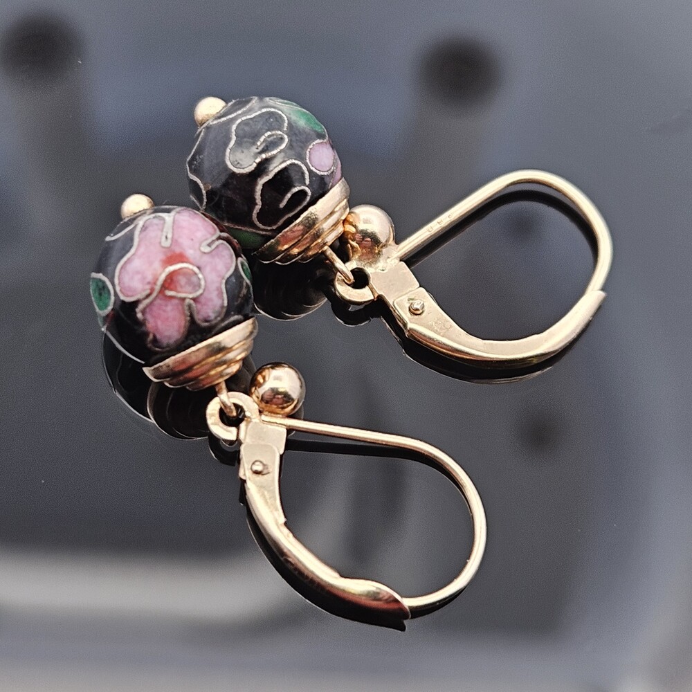 14K Yellow Gold Black Enamel Cloisonné Flower Floral Ball Drop Earrings
