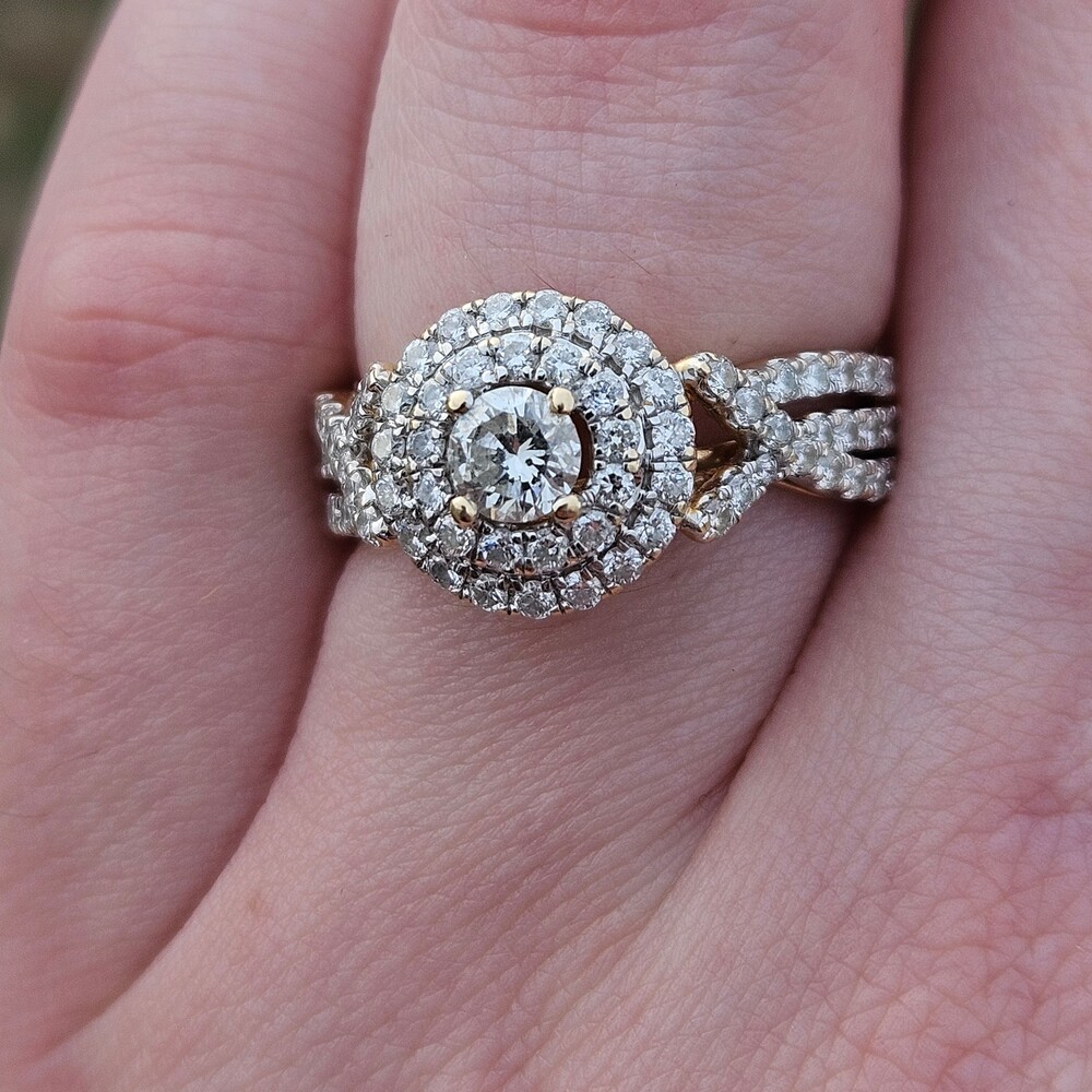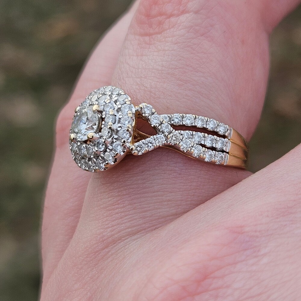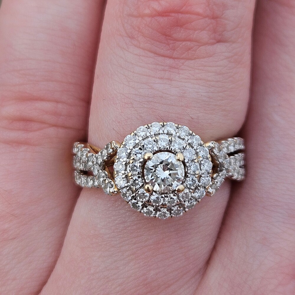 14K Yellow Gold Diamond Double Halo 3 Row Shank Engagement Ring Size 7