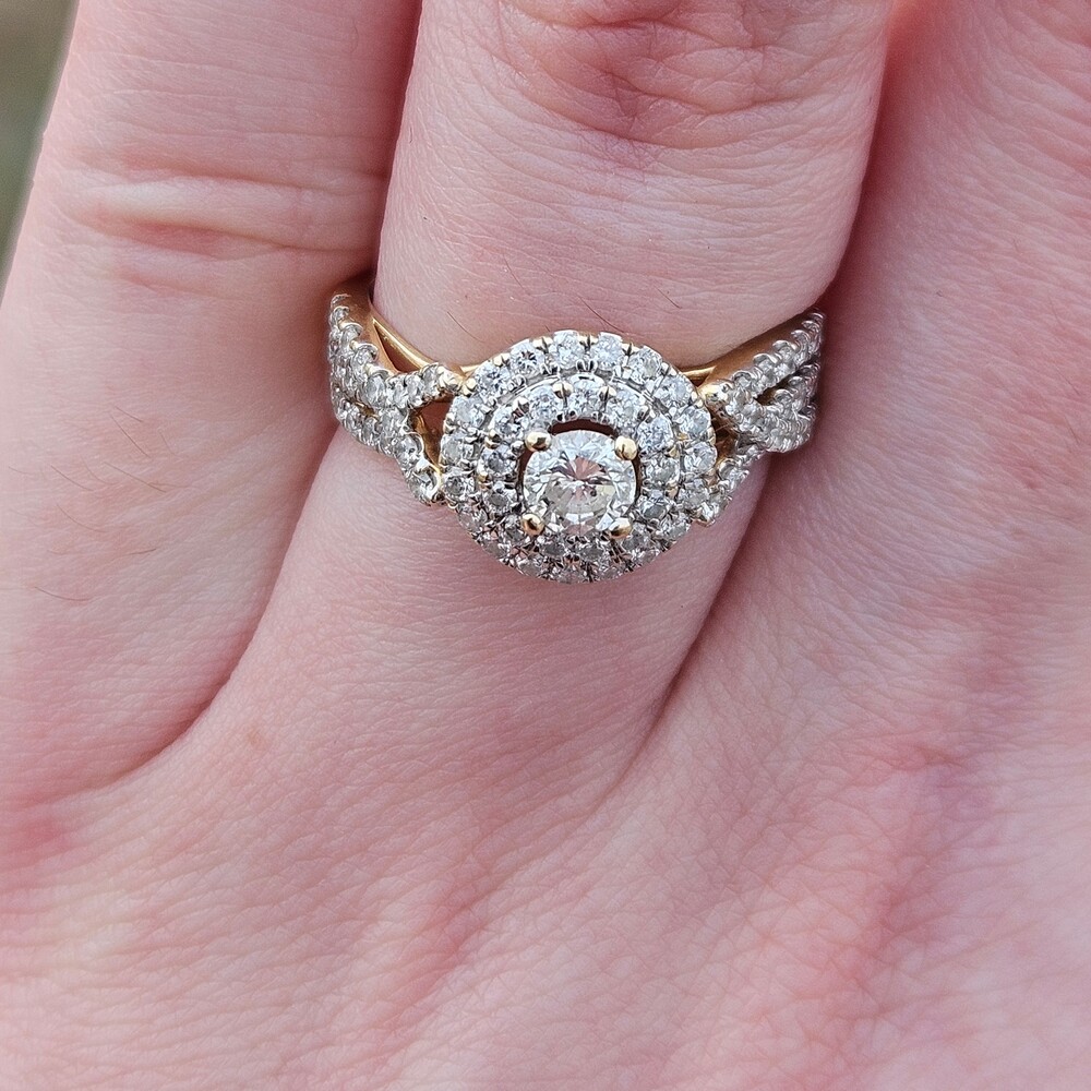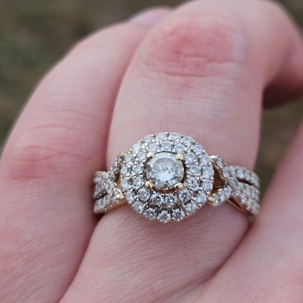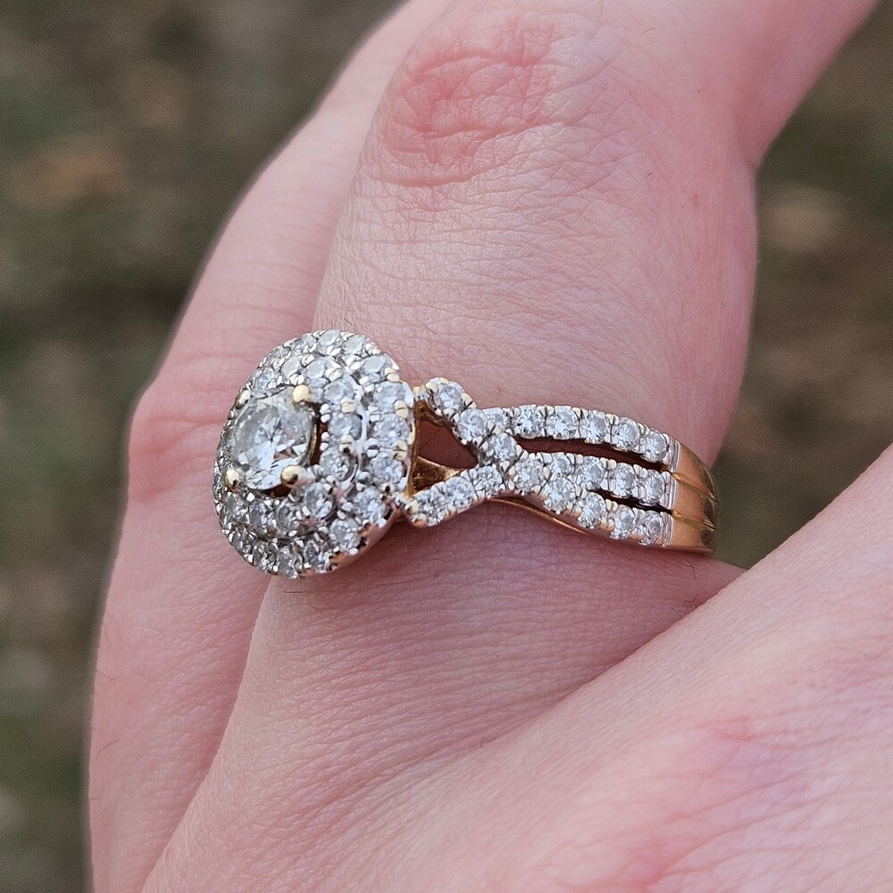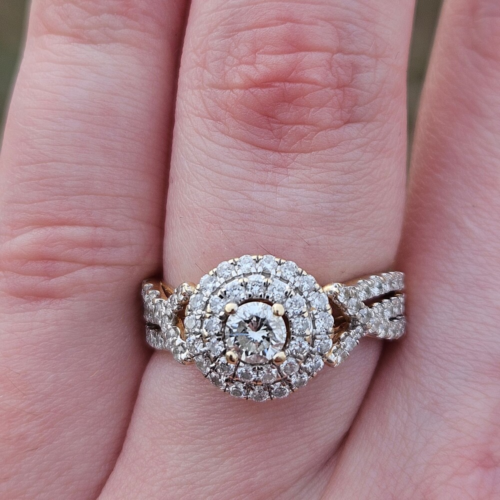 14K Yellow Gold Diamond Double Halo 3 Row Shank Engagement Ring Size 7