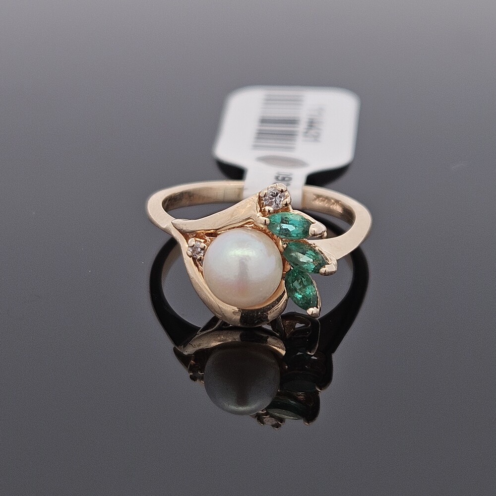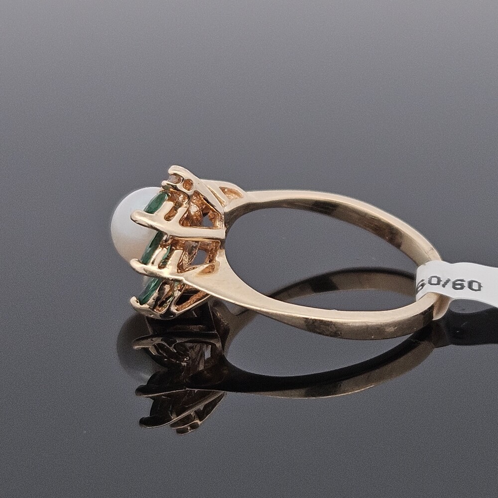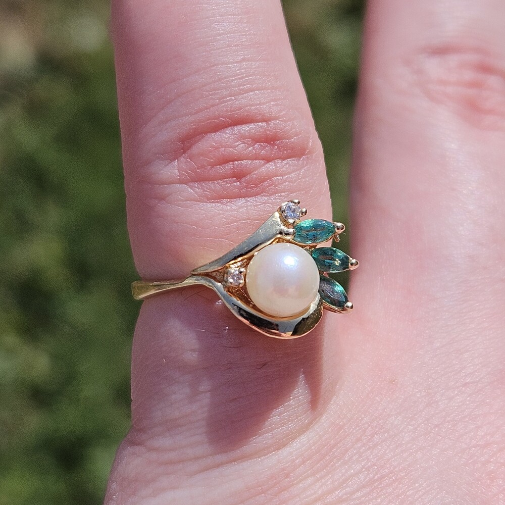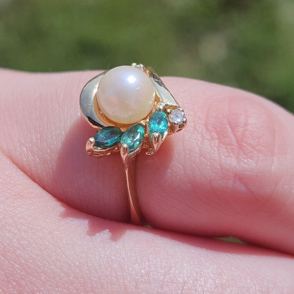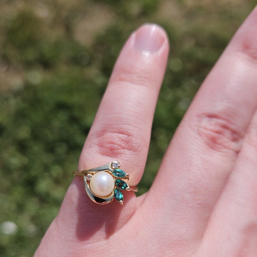 14K Yellow Gold Diamond Emerald & 6mm Pearl Small Cocktail Ring Size 5