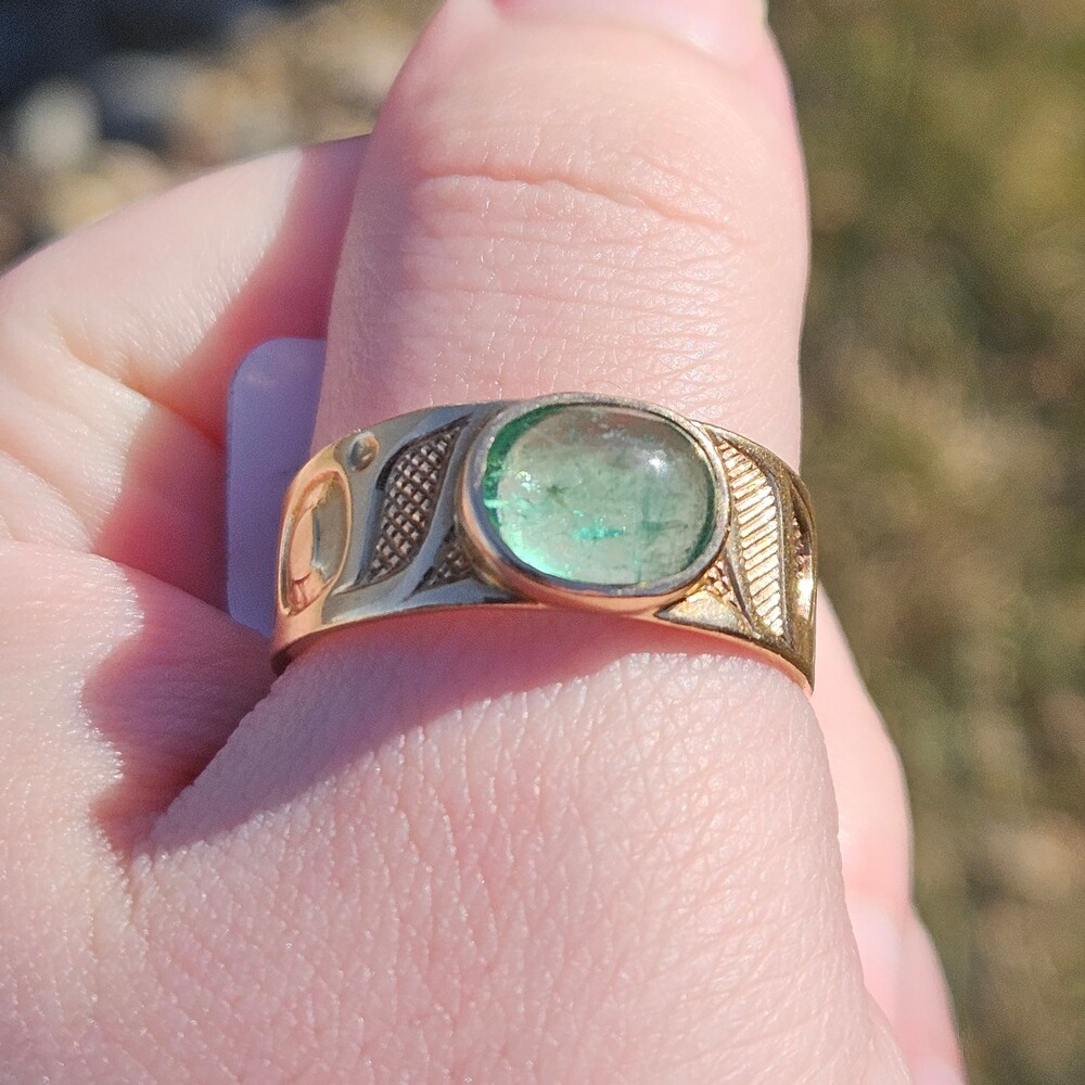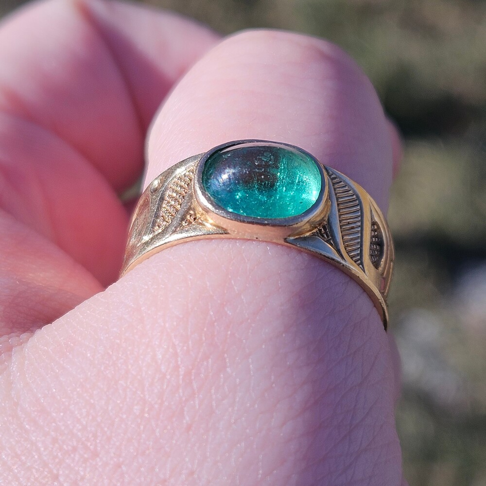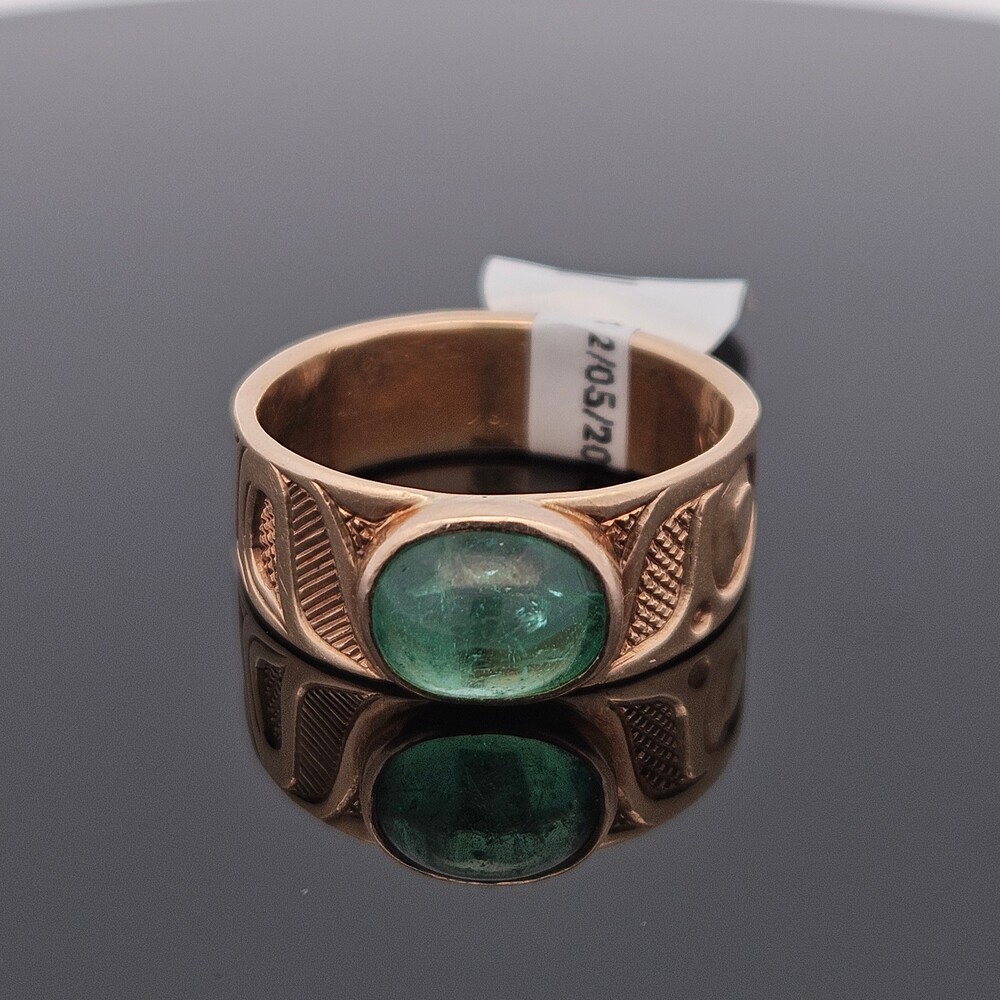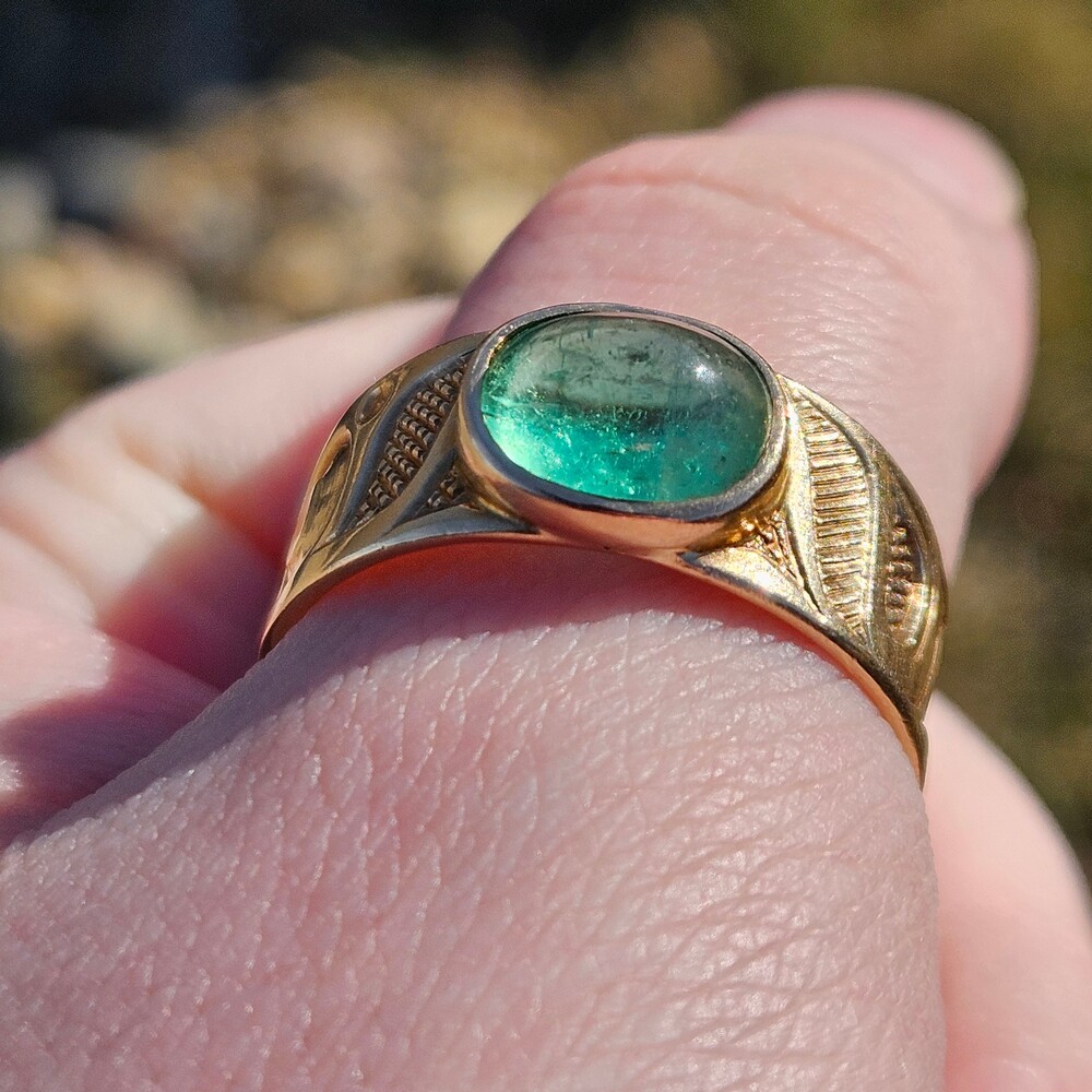 18K Yellow Gold Cabochon Emerald Art Deco Etched Men's Wide Band Ring Size 11.5