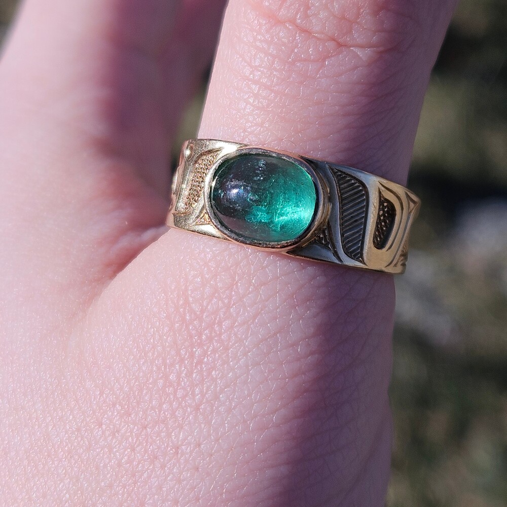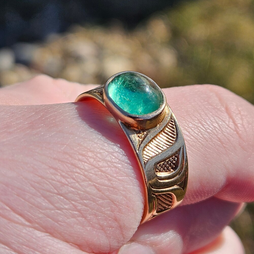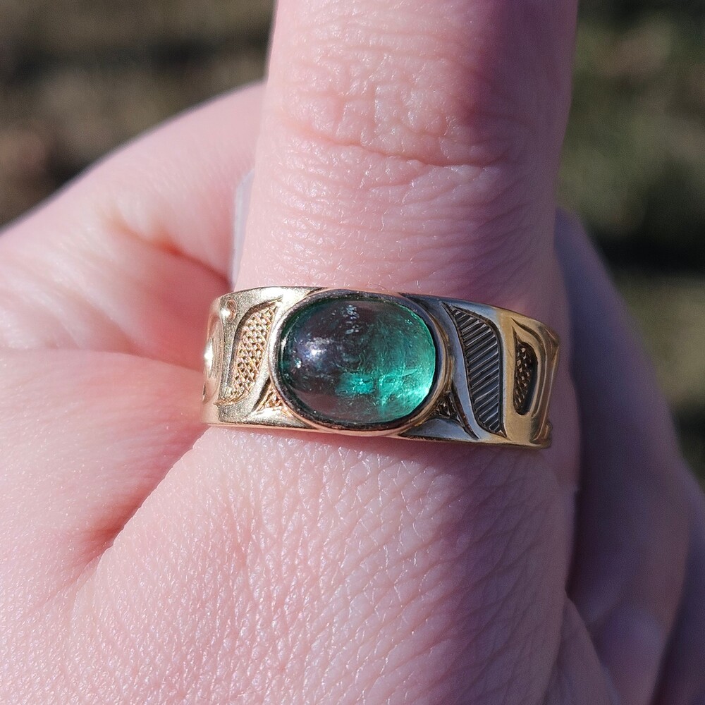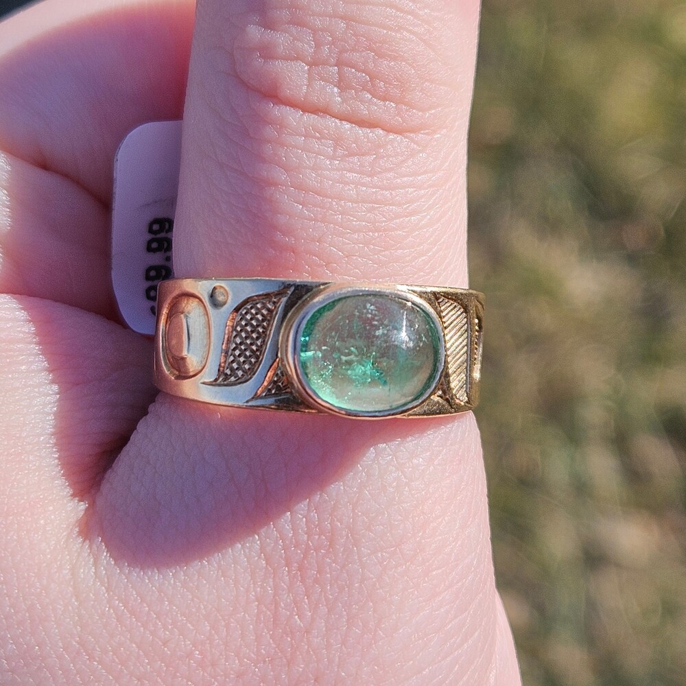 18K Yellow Gold Cabochon Emerald Art Deco Etched Men's Wide Band Ring Size 11.5