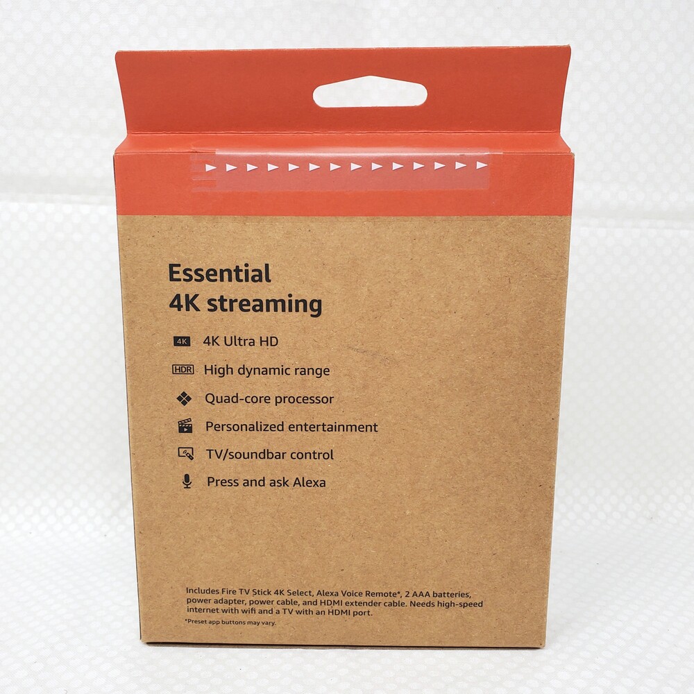 • Includes: Fire TV Stick 4K Select device, Alexa Voice Remote, power adapter, power cable, USB cable, HDMI extender