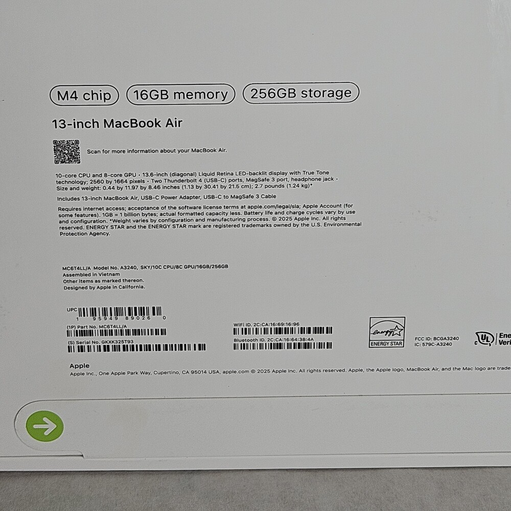 Apple A3240 MC6T4LL/A Macbook Air 13" M4 16GB 256 SSD New in Box