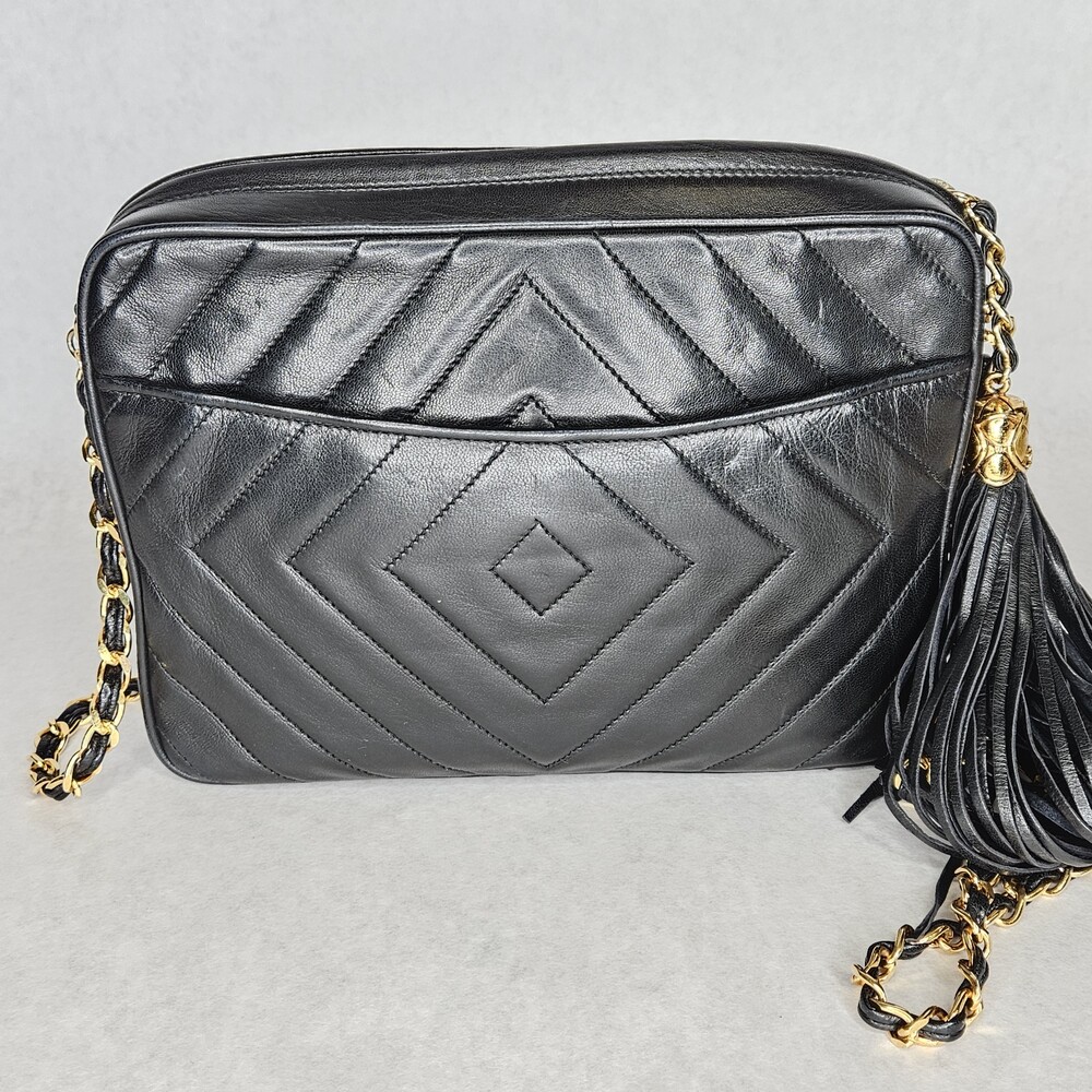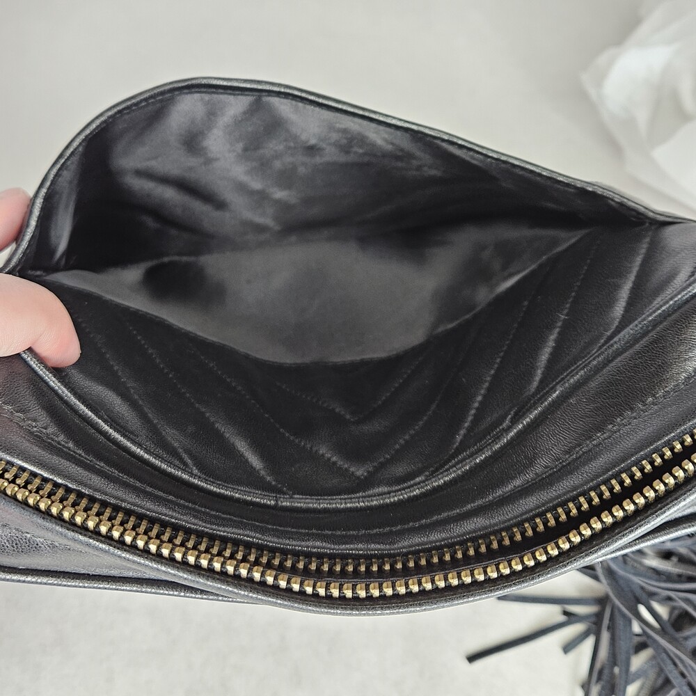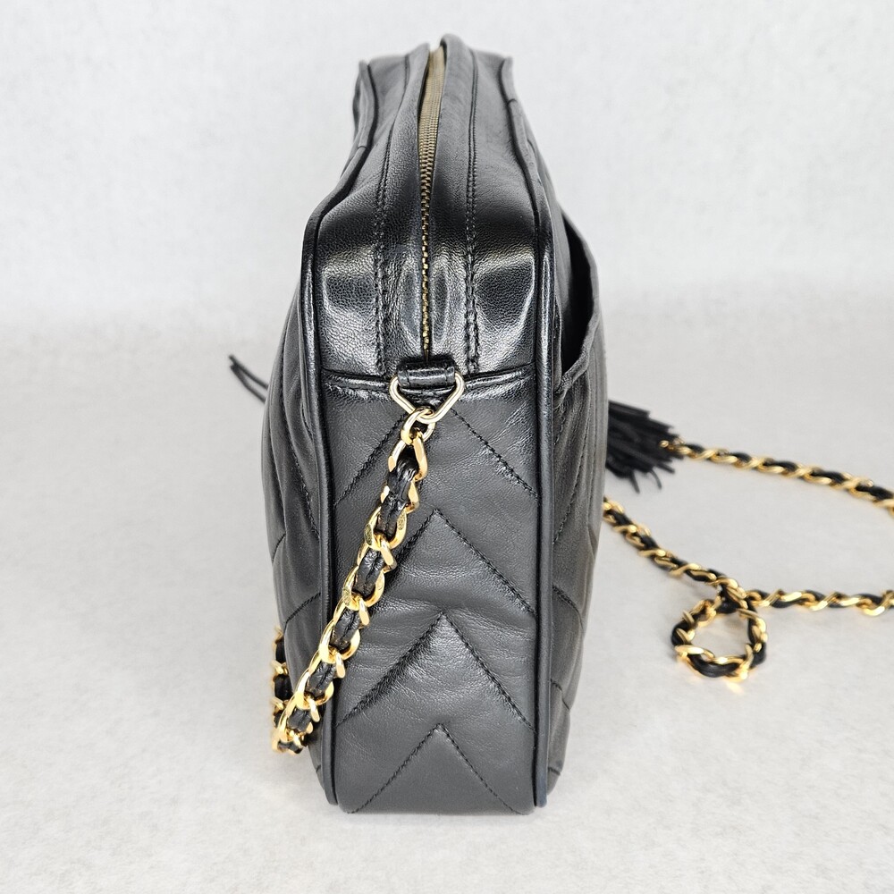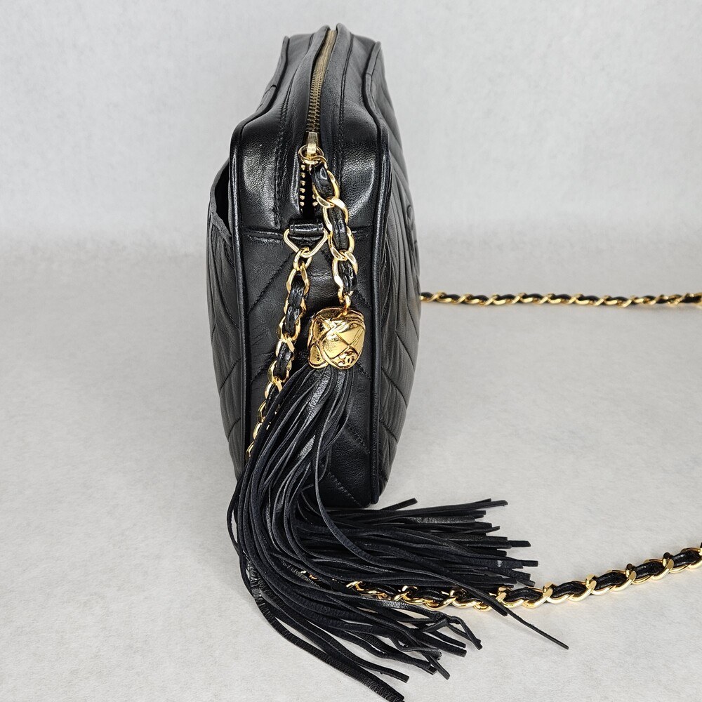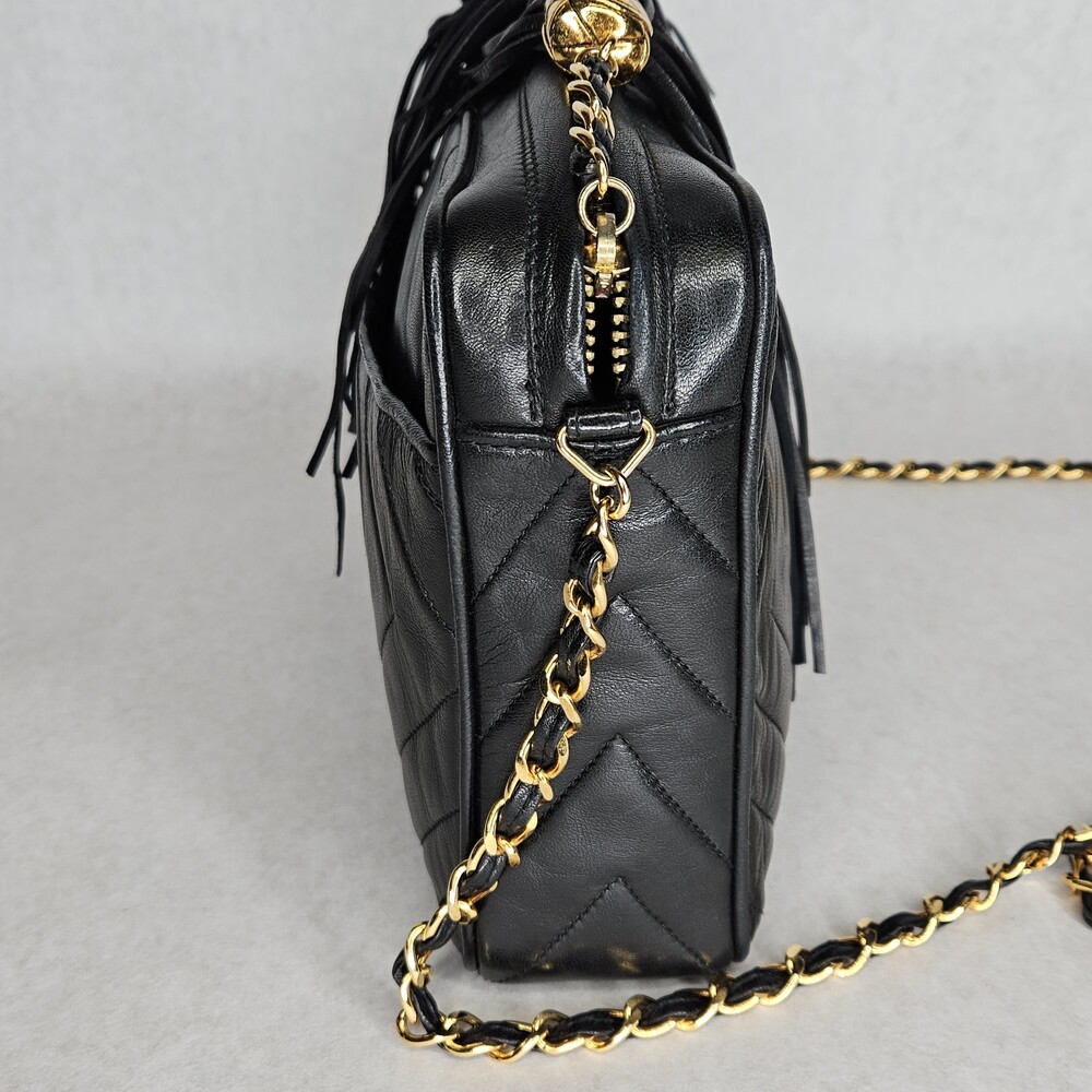 Chanel Quilted Black Leather Crossbody Fringe Shoulder Bag with Strap Tassel COA