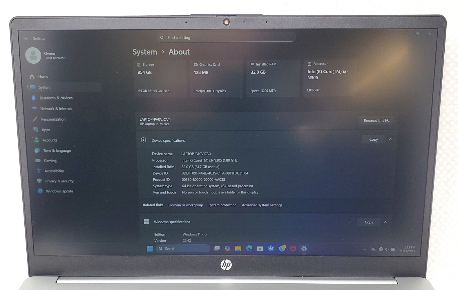 Hewlett Packard (HP 15) RTL8851BE Laptop - Intel i3-N305 - 32GB RAM - 1TB SSD