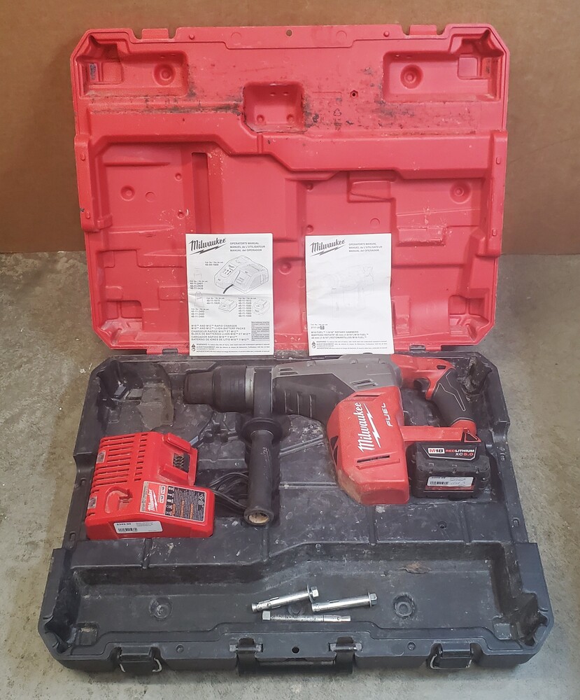 - Includes Case, Handle, Manual, Battery, Charger, And Drill/Hammer Bits