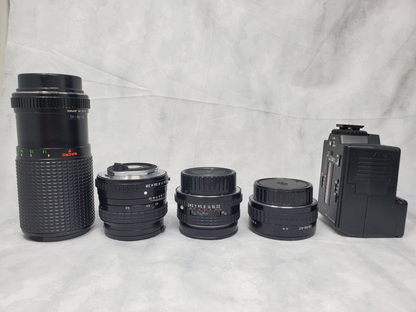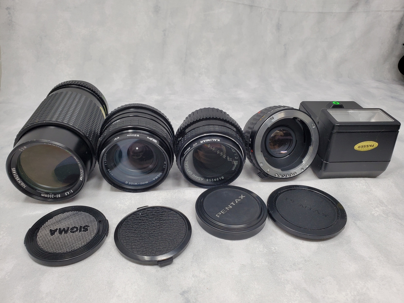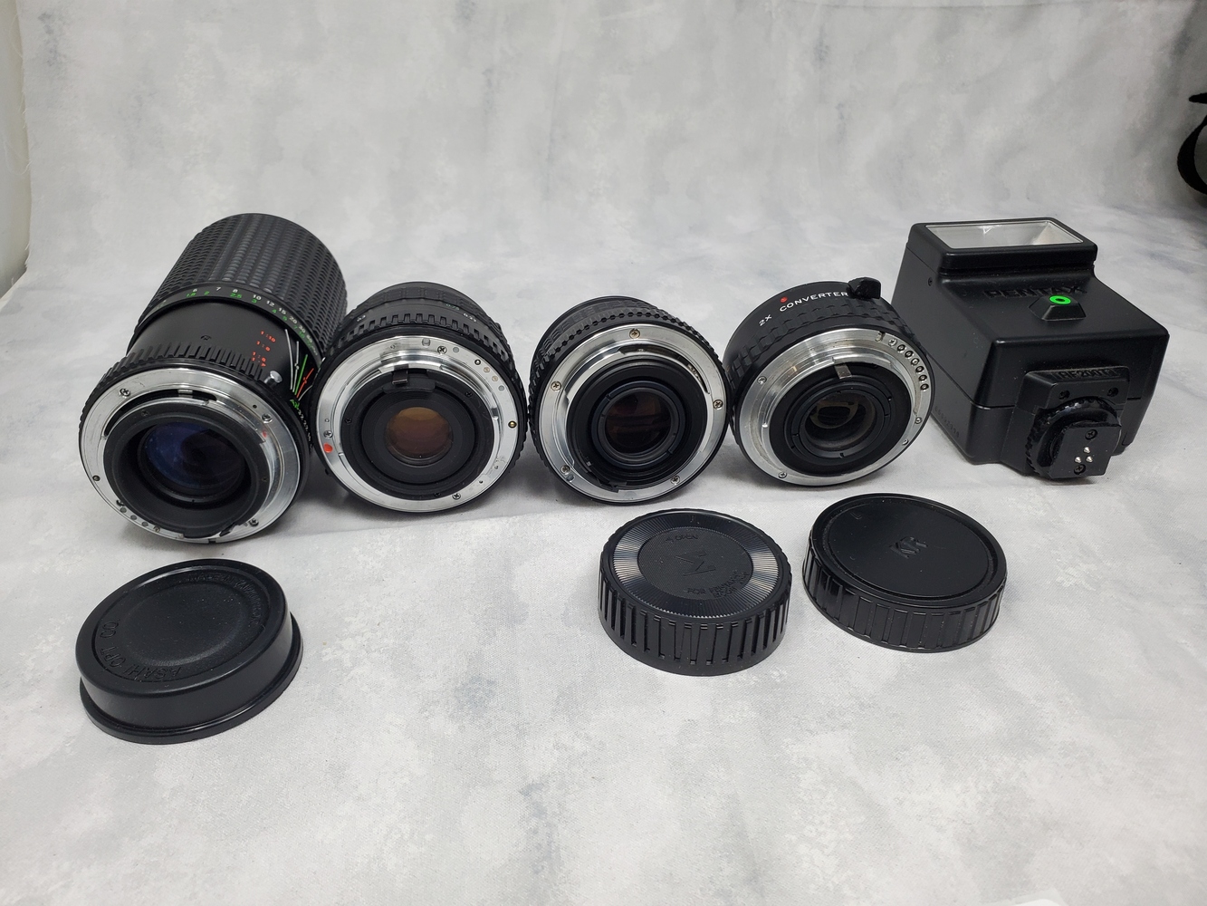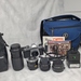 - Includes: Camera & Strap, Bag, Flash, 4 lenses, Lens case, 7 Lens Caps
