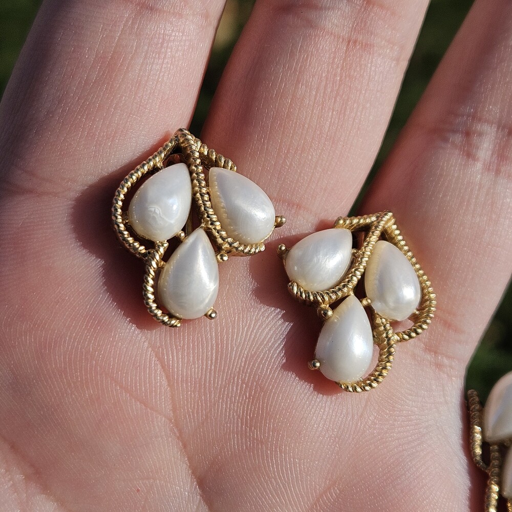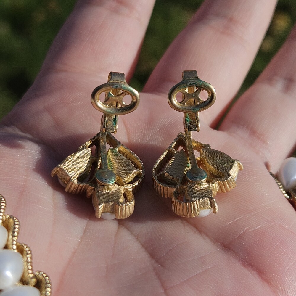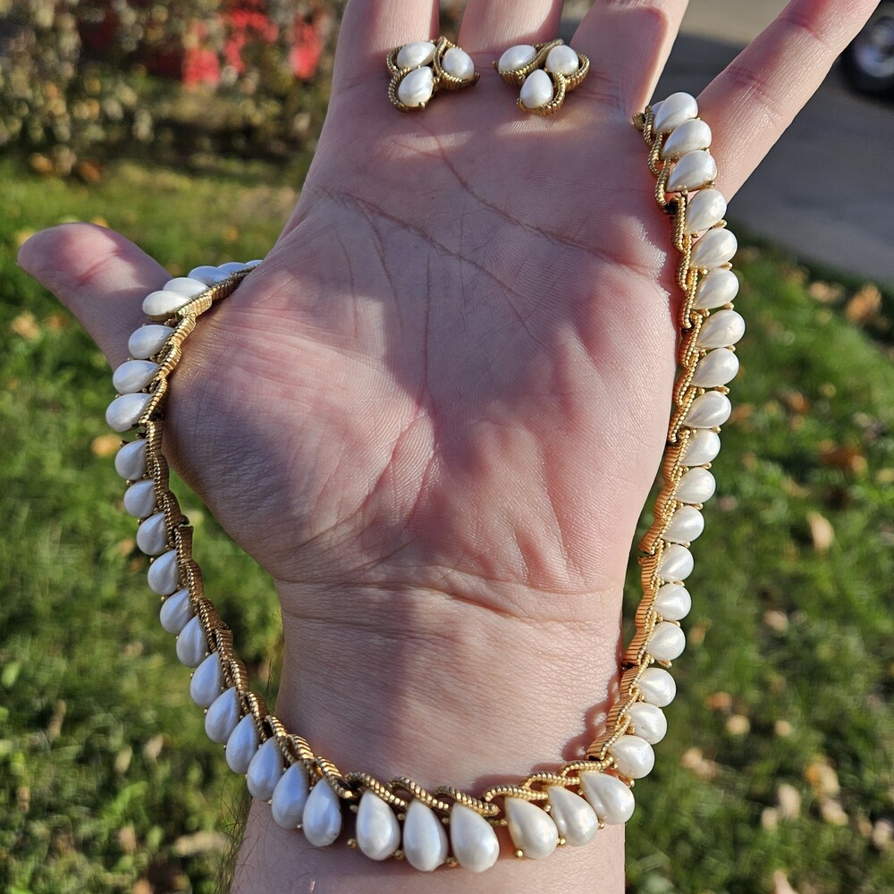 Vintage Trifari Teardrop Faux Pearl Gold Tone Earrings & Necklace Set 15.5 Inch